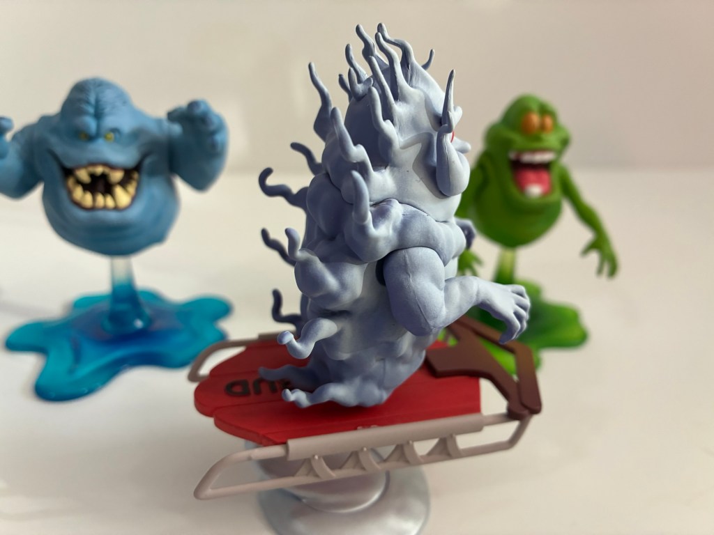 Winston’s other accessories are identical to Peter’s including his gear and the optional gloved hands. Paint on the proton pack and trap are crisp and clean and his effect part for the particle beam is the same as well. The only new items with Winston are the included small ghost and the trap effect. For the trap effect, he comes with Sandman since that’s the larger ghost he’s sold with in a two-pack. The sculpt and paint are quite impressive on this little guy and there’s some translucent electricity around him as well which looks nice. It fits a little more snug in the trap than the past two accessories and I can’t get this one to actually stand when in the trap either so that’s a little annoying. The companion ghost is Rosebud, a Citizen Kane homage in ghost form. He’s more static than Slimer and the intro ghost as his arms barely move, but the sculpt and paint look terrific and I love how he’s riding on a sleigh. He is slightly leaning to his right and I don’t know if that’s on purpose or just a variation in the production. He’s fun though and a nice addition to the other ghosts.