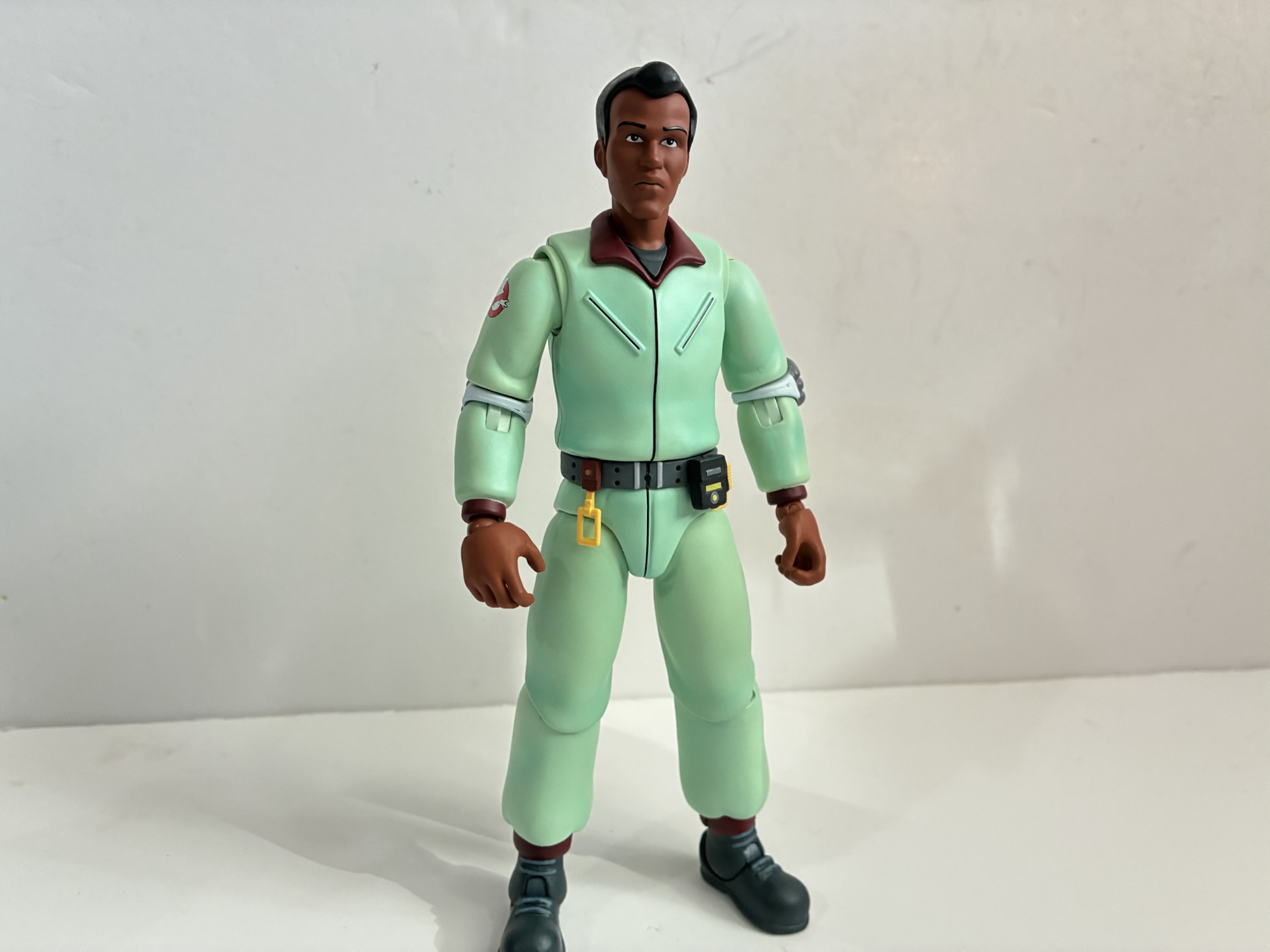 Winston’s articulation is identical to his co-workers which is to say it’s fairly basic. Unfortunately, Mondo hasn’t made any running changes to the production process to improve what’s here. The hips are still very tight, and in particular my figure’s left hip. The other joints are mostly okay while the head is still too restricted. The lower ball joint is set too deep in the neck to allow the figure to look down and the head doesn’t really tilt back either. Interestingly, he has the same ball joint as Peter for the head where as Egon had a larger, more mushroomed, one. The ball-peg shoulders are poor substitutes for butterfly joints and Winston will have to hold his proton wand across his chest to have a two-handed grip on it. He’s only going to hit the most basic of poses and if Mondo ever does do a vehicle for this line all of these figures will struggle to sit down in them.