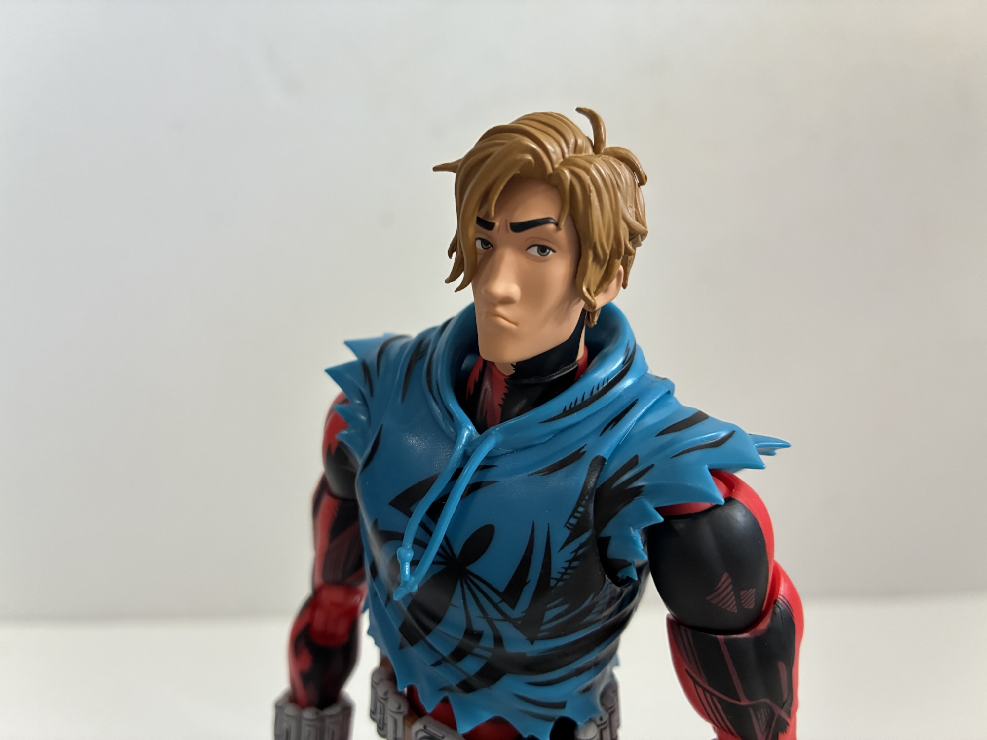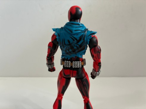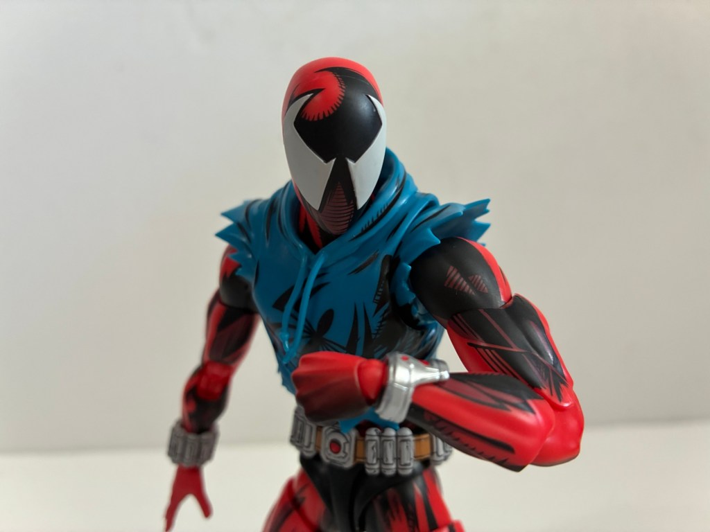 In the two reviews I did of Scarlet Spider action figures I shared the origins of my love for the character’s design. To make it short, I found the appearance of him on a cover of a Spider-Man comic intriguing, but more is as a young artist I much preferred to doodle him in my notebook than Spider-Man himself. And that’s due to the lack of those tedious web lines the traditional Spidey costume contains. And even so, there’s something about the simplified look of the red body suit with a ratty, blue, hoodie over it that works. The shape of the eyes worked for me and the exposed web shooters also looked kind of cool, but what really sold it are the artists (Tom Lyle is the one who is credited as designing the character) who drew and colored this look because that heavy, black, shading just made him seem so much more intense and mysterious.