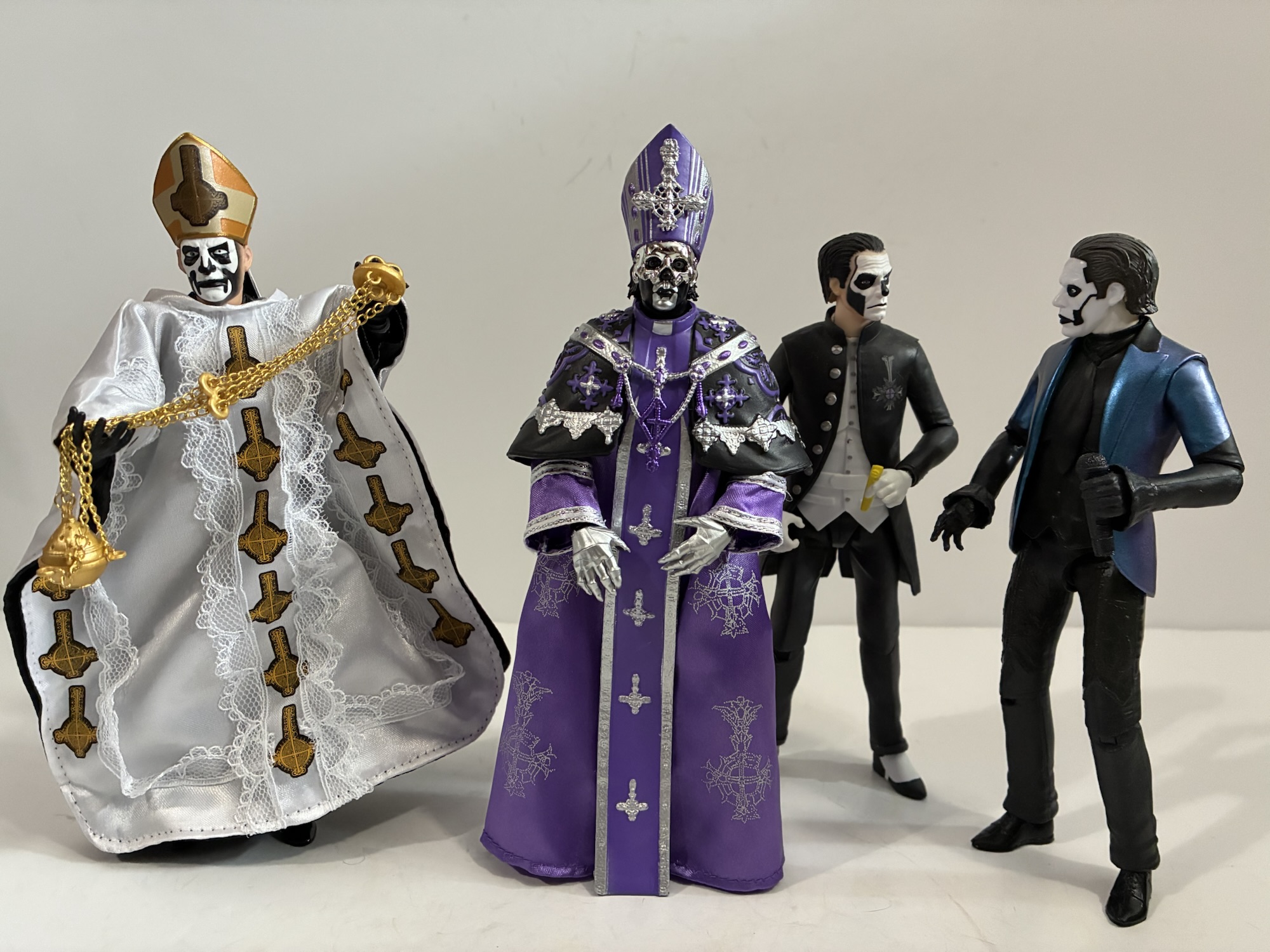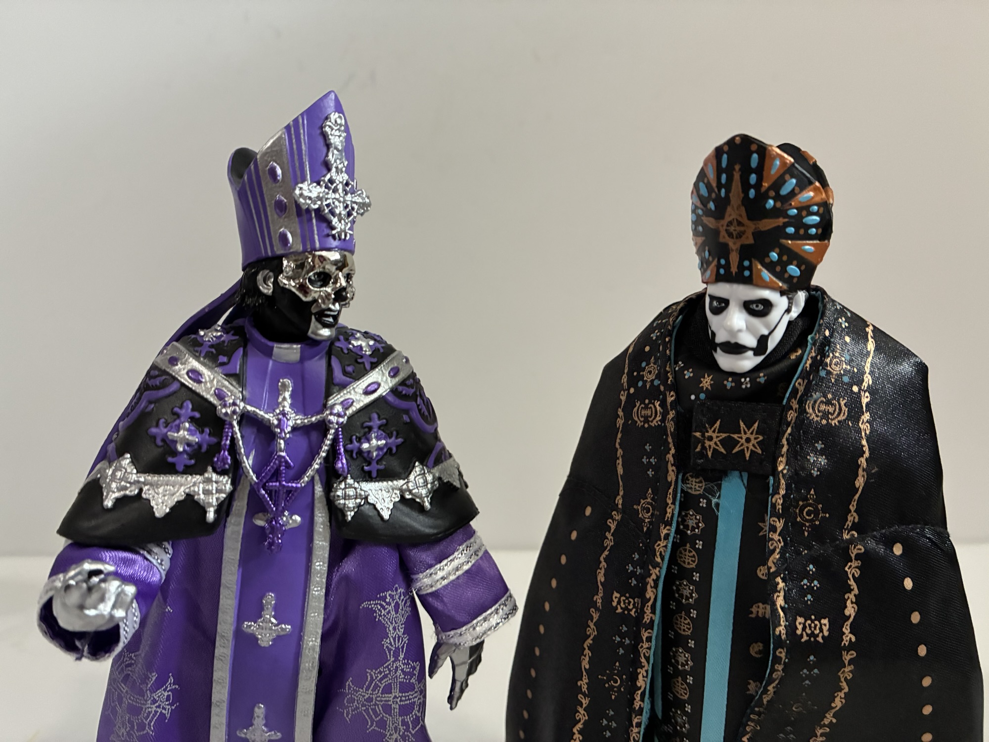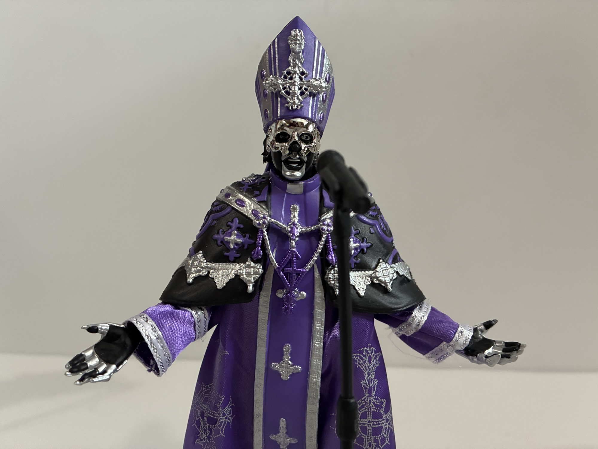 The answer to that question is: kind of. Papa V comes clad in his purple and black robes with the hat permanently affixed to his head. The vestments are adorned with silver etchings and designs and we once again get a two-tiered approach with a main robe and another laid over the top at the shoulders. He has the band’s logo, the Grucifex, hanging over the center of his chest which is connected to the garment that encircles his shoulders (I don’t know what it should be called, but I’m just going to refer to it as a shawl). For a Ghost fan, the look is essentially timeless since it shows up at the end of a video and represents the fandom’s first glimpse of this new character, the long lost brother of Papa IV. When the figure went up for preorder, I wondered what would be under the robe? Not for perverted reasons, but because there’s always another look for the many Papa characters save for the first. Before Skeleta came out, videos for the singles “Lachryma” and “Peacefield” debuted and we saw V in a suit similar to past frontmen of the band, but with a gray/silver blazer. There were no images showing what the base figure looked like and now that it’s here we have the answer which is an unfortunate blank body. Not entirely blank, but basically the same body we saw with the last figure minus the cuffed forearms. Had there been a stage outfit underneath we still would have been short a head as both portraits (and the bonus third) have the mitre permanently affixed to it. Did Super7 request such information and get rebuffed by the band? Would the band not approve a mitre-less V portrait? Those are things I don’t know, but if the more elegant look is a stunner then does it really matter?