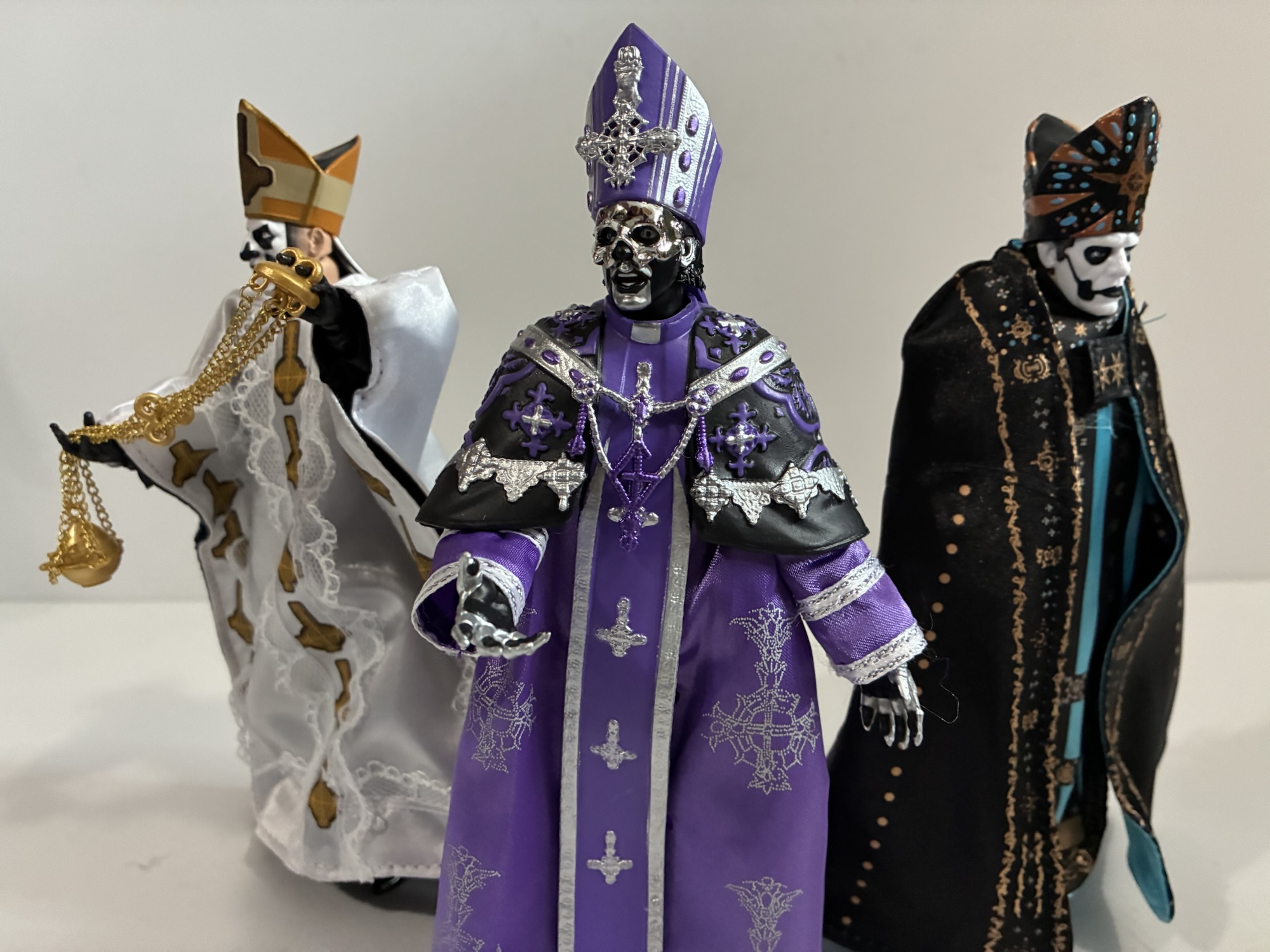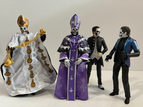 Papa V, or simply V (Vee), was introduced at the end of the video for the lead single “Satanized” off of the album Skeleta. V shows up right at the end clad in his robes sporting his papal hat and looking quite resplendent, if I must say so myself. The look is different from past Papas as he sports a small, skeletal, mask that covers just the top half of his face leaving his mouth exposed. Curly hair pours out from the back of the hat and mask and the skin beneath is painted both black and gray. This depiction appears to be the source for Super7’s latest offering which went up for preorder the day Skeleta was released. Since then, the band has been touring the world in support of the album having just finished up the second US leg. On tour, we saw multiple looks for V which is in keeping with tradition and it lead me to wonder if this particular look would be dated by the time it eventually made it into the hands of collectors and Ghost fans around the globe.