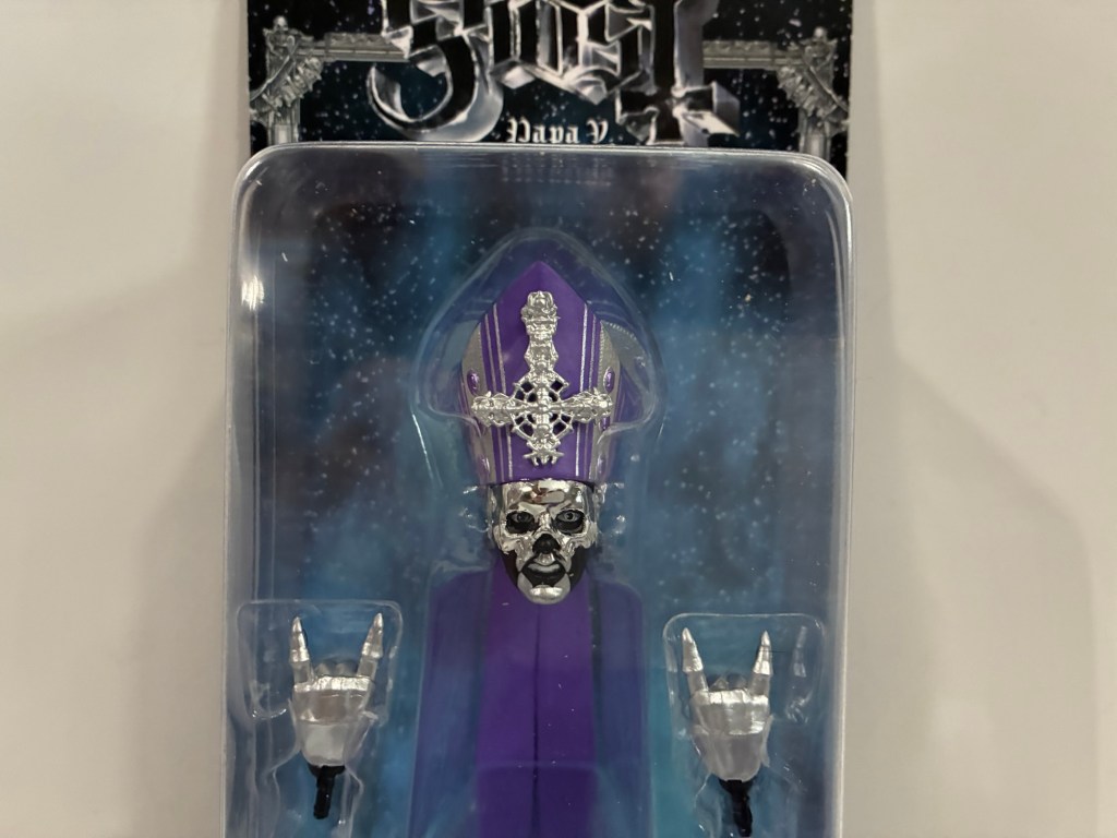Ghost remains the most unlikely mainstream rock act I can recall in recent times. A Satanic metal act that sells out arenas in the United States is not something I ever expected to see in my lifetime. It was basically the joke in a show like Metalocalypse – a “Can you imagine if such a thing happened?” Super7 got into the Ghost market pretty much right as the profile for the band started to rise. Their ghoulish imagery lends itself well to merchandise, and while heavy metal action figures aren’t a huge market, it seems to have worked for the company as we are on our fifth version of a Ghost frontman. I have to believe a lot of the credit to that should go to former Super7 designer and current Mattel employee Kyle Wlodyga – an open Ghost super fan who worked on these figures. And while Super7 doesn’t list the people responsible for their product on the box, I’m assuming he had a hand in today’s figure of the newest frontman for the group: Papa V Perpetua.