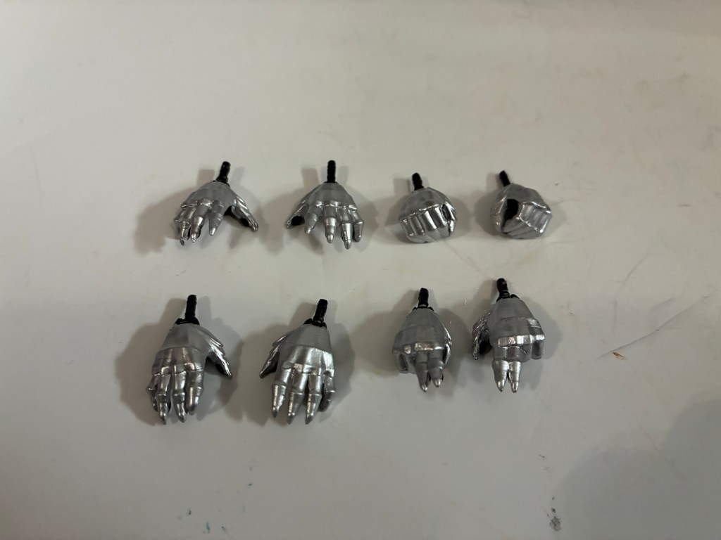 So that’s a bummer. It does indeed make the figure look better, but he might as well be a statue. You can work the elbows slightly and that’s about it aside from the head and hands. And the joint in the neck on mine is pretty loose. I’m a little nervous that it will break if I switch portraits a lot. As for the portraits, you get neutral, open mouth, and if you ordered from Super7 directly you get a bonus pack with a grimacing expression. To do V’s portrait, Super7 sculpted the head and painted the face black and silver and then glued the mask on over it. The mask has an almost mirrored finish, like chrome, and it looks great on all of the faces. V’s gloves are sort of similar in that they are designed to look like metal. Super7 gave them a silver coat, though the sculpt is a little softer than I’d like. The images also seemed to imply they’d have the same finish as the mask, but that’s not the case. And for hands, we get open, gripping, “expressive,” and what Super7 refers to as As Above, So Below hands. In other words, they’re two-finger pointing hands. The bonus pack also comes with a set of “horns” hands which always makes sense to include with a heavy metal musician. The black microphone and stand that every Papa has come with is also included. It’s a fine spread, though the hands are not particularly useful given the articulation limitations. He can place his hands against the front of his body or go out slightly to the side and that’s pretty much it. The head rotates and it’s on a double ball peg with a ball joint at the neck so there’s some tilt, but the tails on the mitre are pretty stiff plastic so he can’t look up much. Since his legs are also hidden, I kind of wish they did different feet than the old ones as they’re not the easiest to stand. Something a little bigger and wider would have helped there since there’s really nothing to do with the legs. They exist just to have him stand on your shelf.