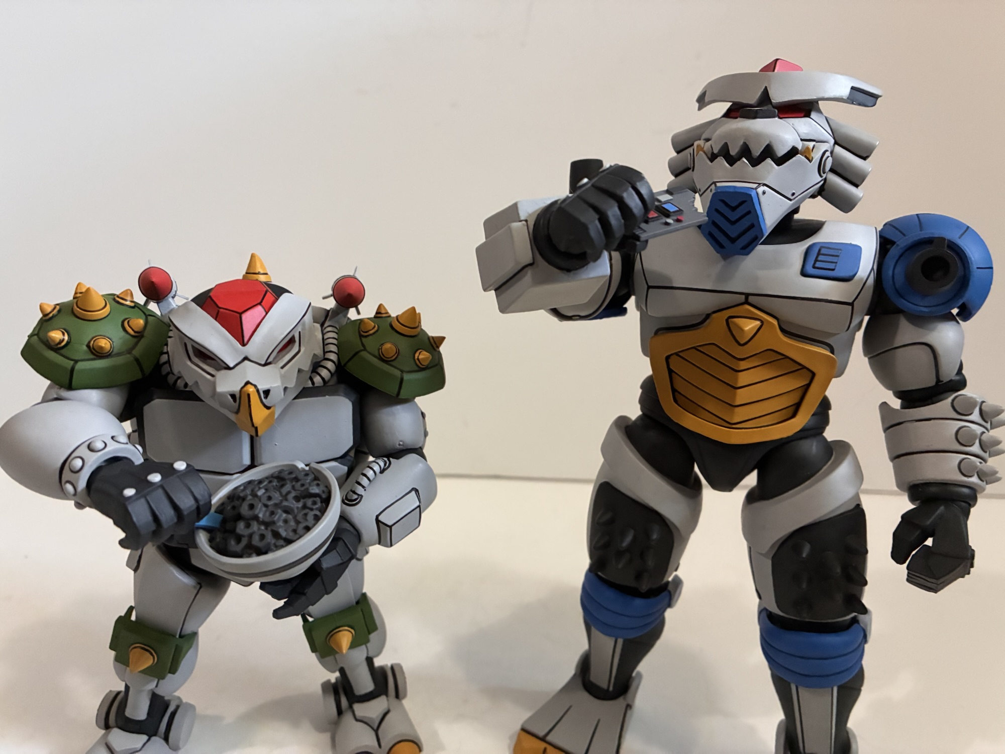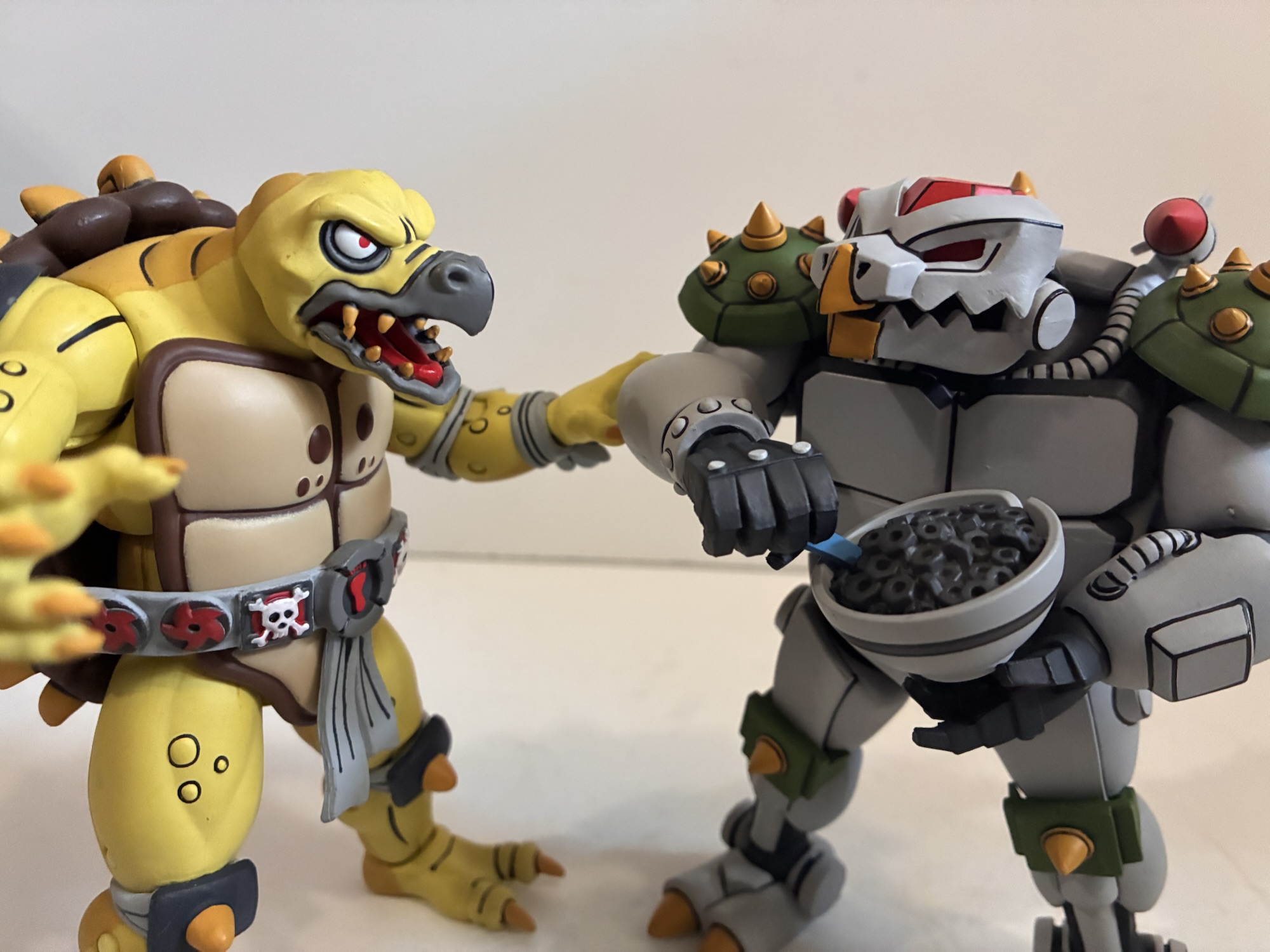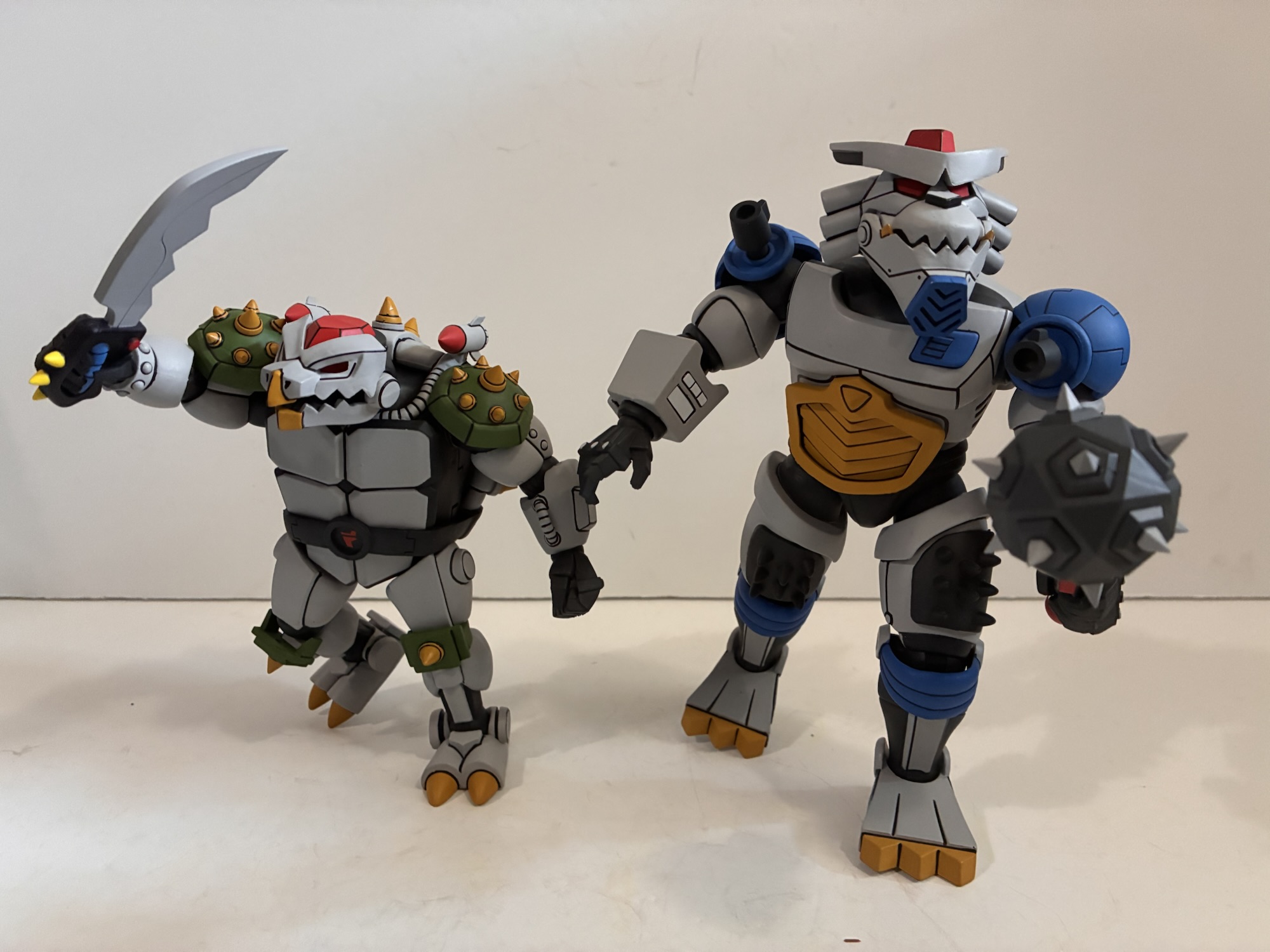 The vintage Playmates toy line for Teenage Mutant Ninja Turtles had no shortage of variants. There were beach turtles, police turtles, hockey turtles, and so on. We even had something akin to Operation: Desert Storm turtles. In looking back, it seems like few stones were left unturned unless you want to get into the weeds of licensed collaborations (the TMNT x Star Wars collab was just never meant to be, unfortunately), but don’t tell that to the fans of today still brainstorming and coming up with concepts never before explored by Playmates or anyone else. People like Sylvain Plantier, a self-described toy designer and illustrator who had a dream of robotic versions of the duo Tokka and Rahzar from Teenage Mutant Ninja Turtles II: The Secret of the Ooze. The duo was inserted into that film pretty much because TMNT co-creators Kevin Eastman and Peter Laird wanted nothing to do with the dimwitted duo of Bebop and Rocksteady, not that it stopped the writers of the film from making Tokka and Rahzar giant, literal, babies. At least they looked scary? Due to the popularity of the characters and film, the two made their way into the Teenage Mutant Ninja Turtles cartoon where they were quite different as characters, but visually were identical to the Playmates interpretations of the two created to promote the movie as toys. And since their TV counterparts, Bebop and Rocksteady, appear in both the toy line and the show as robots, why not extend the same to Tokka and Rahzar?