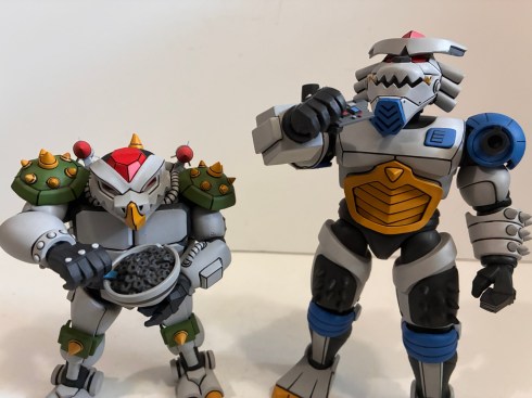 Robo Tokka and Rahzar follow in the same sort of look as the robotic Bebop and Rocksteady. Plantier did a great job of creating some all new characters, but also ones that if seen by someone unfamiliar would cause them to start searching their memories for such an episode of the show. Both characters utilize some blocky components and hard edges, but also plenty of curves like one would expect to see in the show. The two are predominantly a light gray and slate gray, but they also each incorporate their own unique color to the design. Like Bebop featured red and Rocksteady yellow, Tokka has some green accents via the knee pads and pauldrons while Rahzar has some striking blue parts most prominently featured in his pauldrons and knee pads. I like how Plantier apparently gave consideration to the Playmates figures as well as both characters feature a red dome on the top of their head which I assume is to mimic the light-piping feature of the vintage toys. It would have been cool if NECA could have provided an alternate head with such a feature, but this works fine.