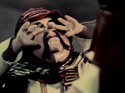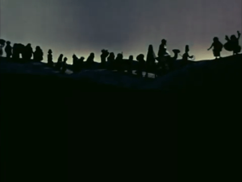 The crowd eats it up regardless and Haramad is getting ready to pass the hat and collect his reward, but then Aaron goes and screws it all up. As he looks at the faces in the crowd, his rage consumes him. The film juxtaposes one smiling guy with the smile of the bandit that murdered his parents (they’re probably the same puppet, though I don’t think we’re supposed to assume they’re literally the same characters) and you can understand why this might set the kid off. He lashes out, calling them thieves and knaves and the crowd predictably turns on them. They’re forced to make a run for it back out into the desert.