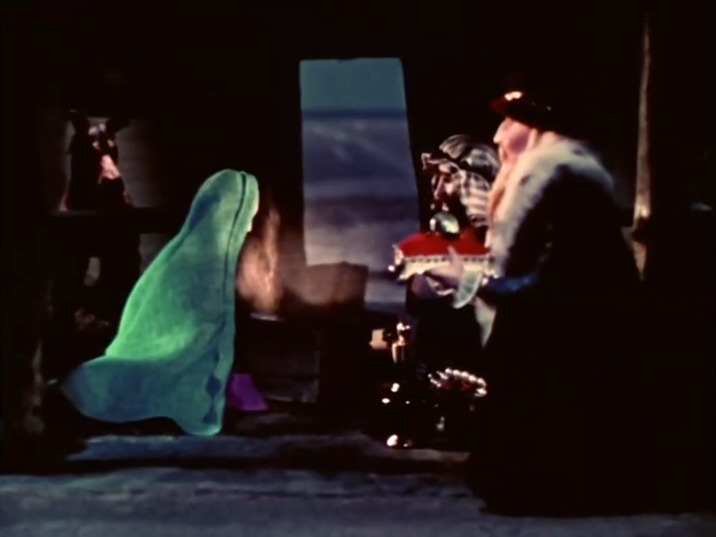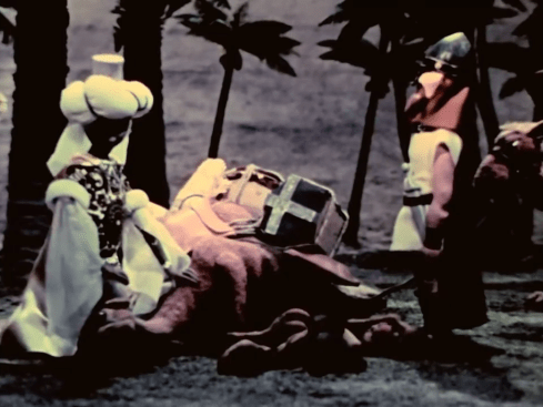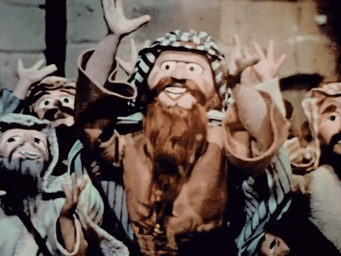 The valuables prove to be perhaps too much. One of the camels being loaded with the gold and other assorted gear collapses under the weight of it all. Casper is shown having some sympathy for the beast, but he doesn’t appear to possess any regret over literally working the animal to death. The other animals are already overloaded too so they have no where to put the remaining gear. That’s when one of the other kings, Melchior (Frees), suggests they try and purchase the camel they saw with Haramad’s troupe. Aaron hears this and obviously objects, but Haramad is more than willing to talk business. We get a time cut to Haramad with a mighty sack of coin and Casper remarking that he drives a hard bargain. It would appear Haramad raked them over the coals, but hey, they’re kings so they can probably afford it.