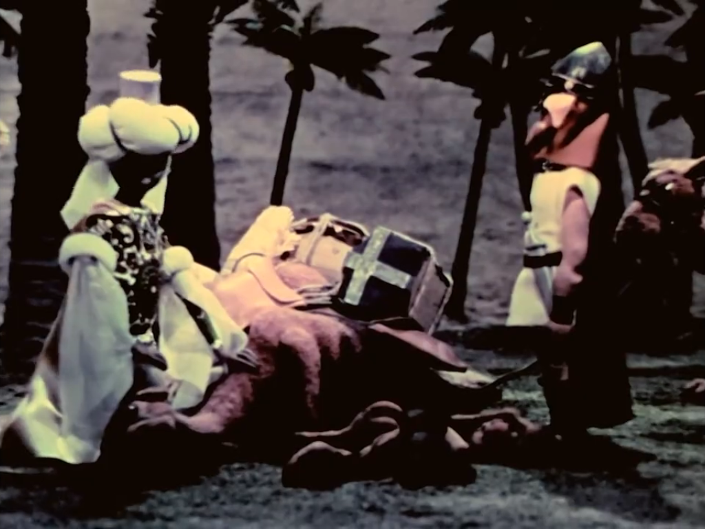Unfortunately for Haramad, these kings are in no mood to hang around. They immediately start to break camp as Haramad comes charging in urging them to stay. He’s met with spear tips as a soldier commands he stand down and refers to him as a knave, which seems to break his spirit. If you’re unaware, a knave is a deceitful person or servant. It’s apparently the strongest insult they could get away with. One of the kings approaches, Casper (Frees), and orders the men to stand down. Haramad then pleads his case, but finds out the kings are not sticking around. They’re following a brilliant star that has appeared in the sky and they must make haste. What’s Haramad to do? Nothing but sulk. As he sits and watches the camp get rounded up, Ali helpfully points out all of the valuables they’re hauling including glowing sacks of gold. Haramad sounds like he’s about to cry.