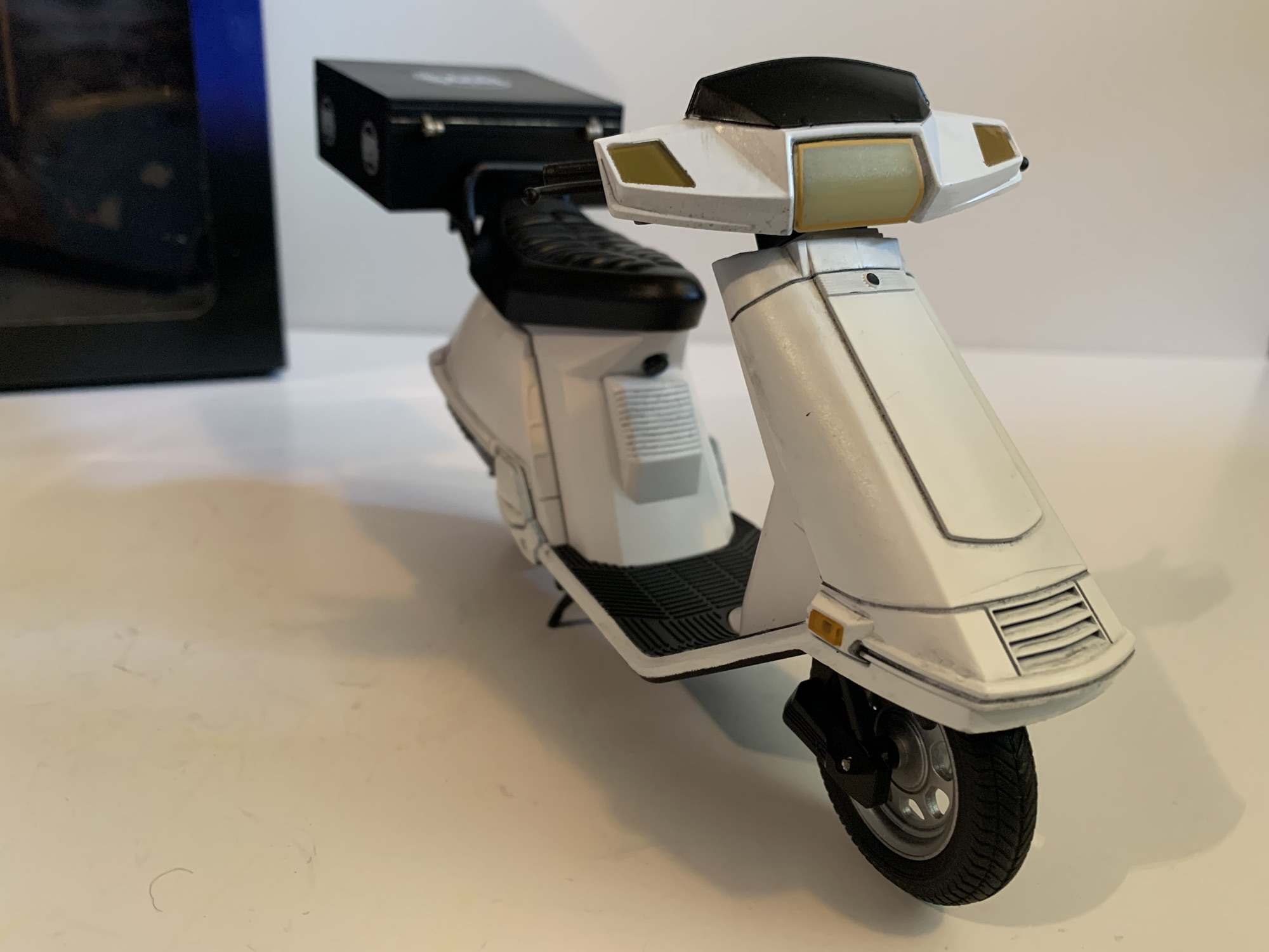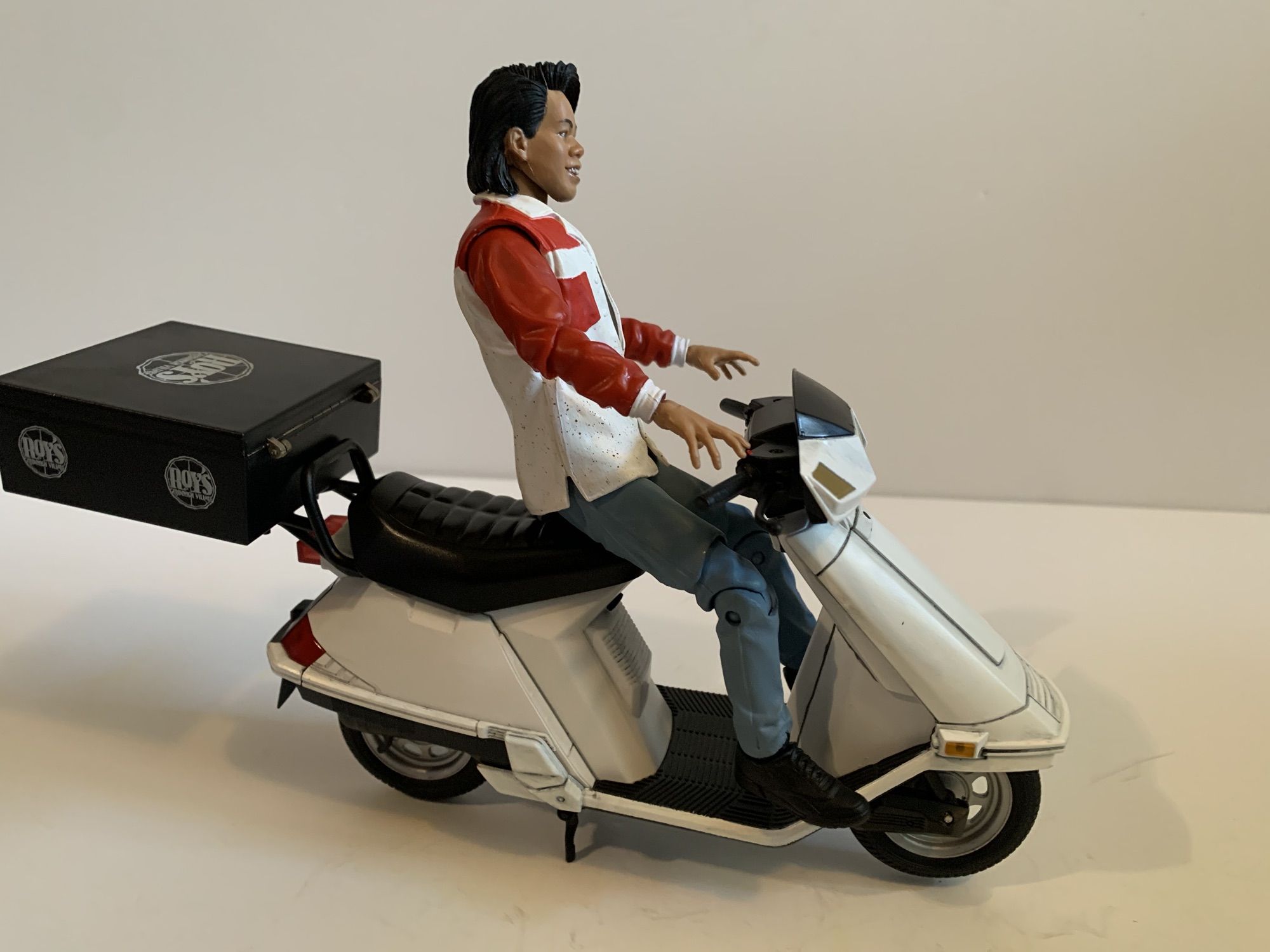 Keno can hit some of his martial arts poses from the film, but nothing crazy. He does have one real flaw when it comes to articulation and it concerns the other half of this release: the scooter. The scooter is basically being priced like a stand-alone figure. It’s made up of a fairly hard plastic and has actual rubber tires. The handle bars rotate and rotating them does cause the front wheel to turn with them which is cool. There isn’t much detail on the dash, but the entire body of the scooter looks pretty convincing. The plastic has a little shine to it which works for a motor vehicle. The headlights are non-functioning, but they’re at least cast in translucent plastic. The scooter even has accessories of sorts, or you could just think of it as some assembly required. The carrying case for the pizza goes on the back and the frame for it has to be plugged into the scooter first. After that, it just tabs on and looks good. Best of all, it’s fairly lightweight and the scooter has no issues supporting the weight of the case with or without the pizza pocket inside it. There’s also a kickstand to keep the bike upright, though it’s a little loose and I found it giving out on me a lot when trying to pose Keno with the bike.