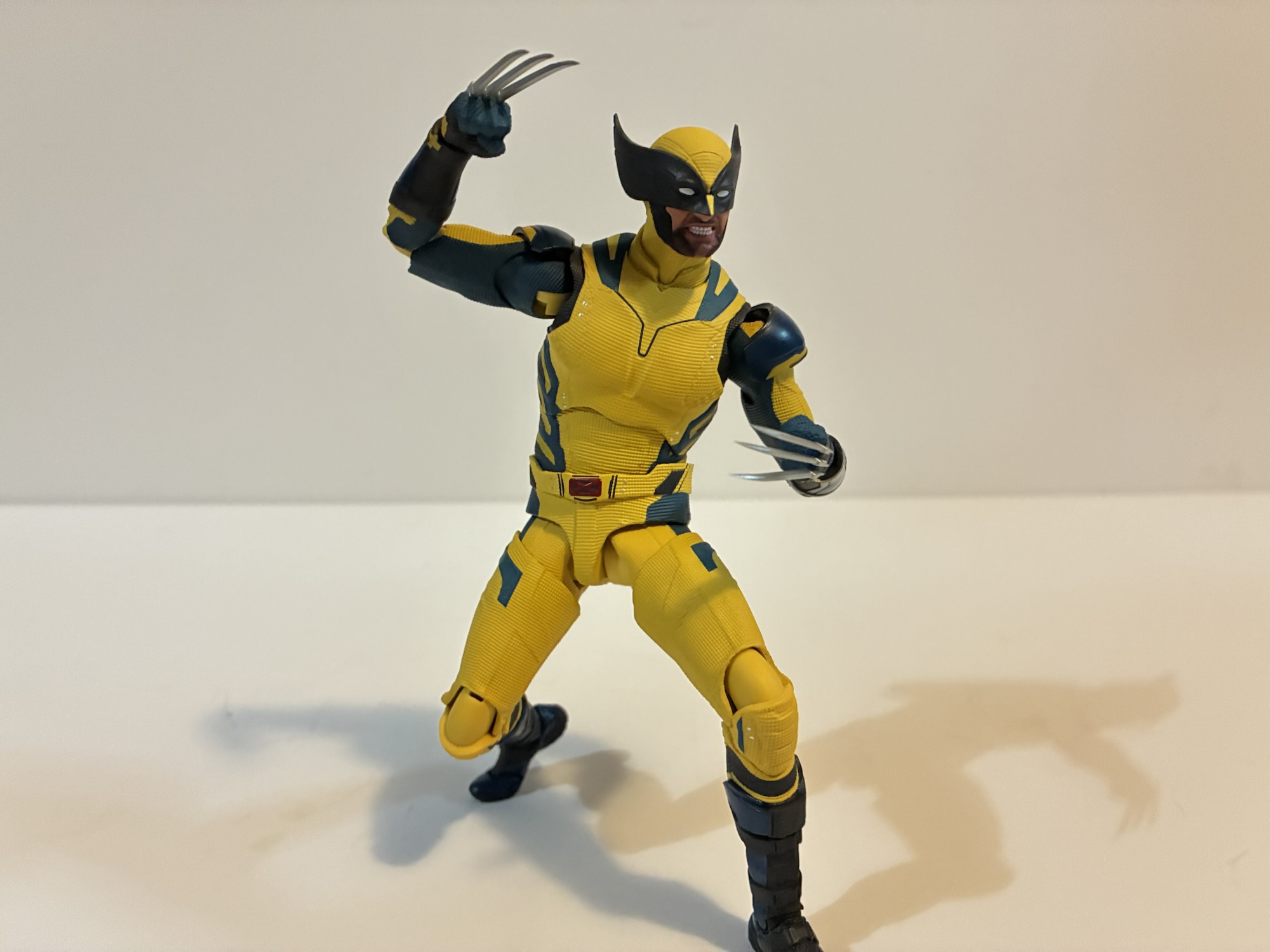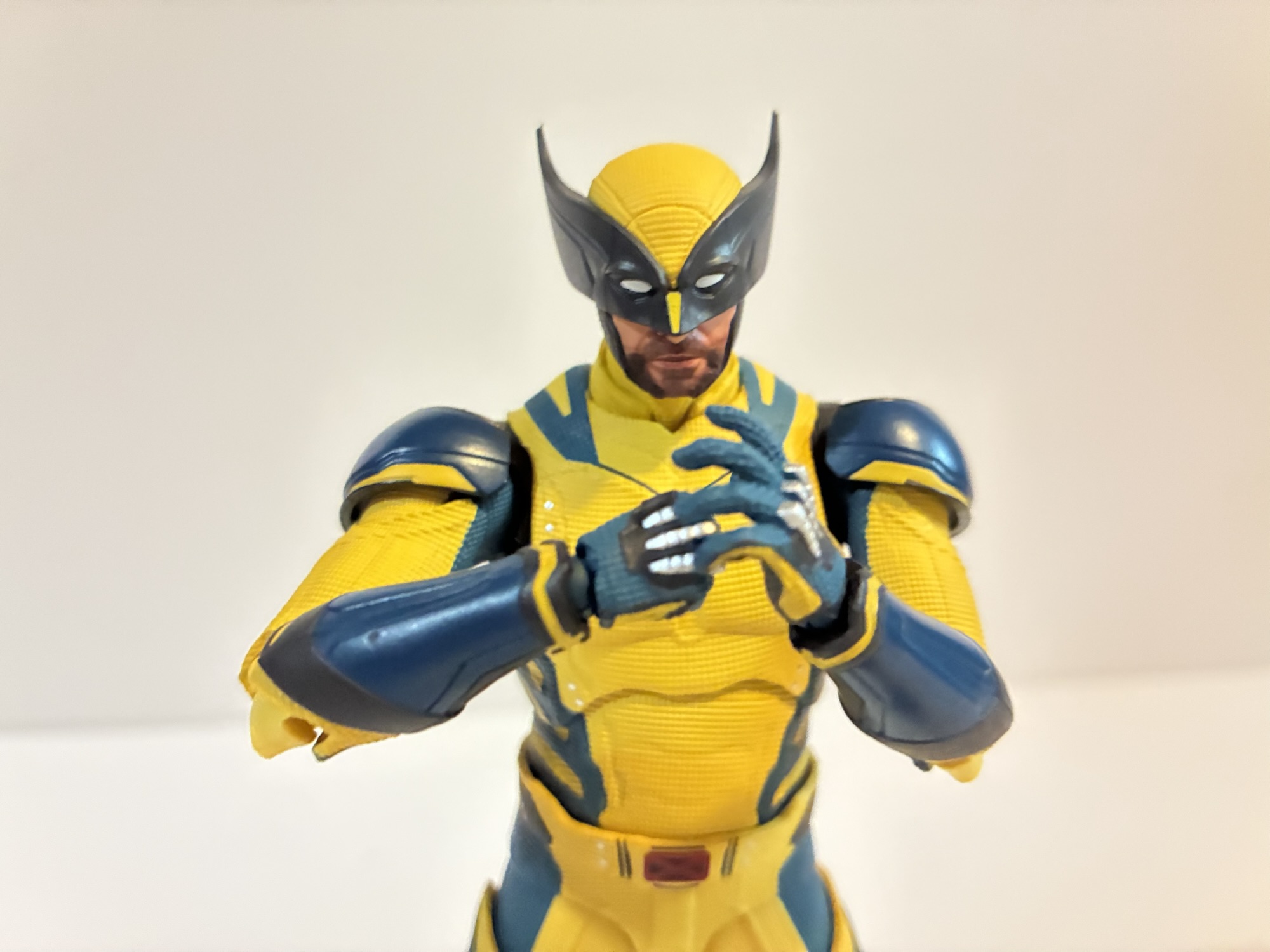 Wolverine stands at approximately 6″ to the top of his head, or just a little taller. Hugh Jackman is 6′ 2″ so that little tick over the 6″ mark basically puts him at an accurate 1:12 scale, assuming the boots he wore in the film didn’t add an inch or two. He is shorter than the Legends version which I had at 6.5″, but that’s pretty consistent for Legends which tends to run a little bigger than true 1:12 scale. He seems a little shorter than the SHF Deadpool though that seems to mostly be in the head. That Deadpool has an oversized melon that becomes more apparent when placed with this figure (for the record, Jackman and Reynolds are both listed as being 6’2″). The costume is textured all over like the one from the film and it’s comprised mostly of colored plastic. The yellow is a pale yellow, especially compared with the more saturated Legends release that is more like honey colored. This shade looks more accurate to my eye. The blue and black is what’s painted, as well as the tiny silver buttons, and everything is pretty clean. The finish is nice and on the blue of the gloves, boots, and shoulder pads there’s a bit of a glossy finish which reflects the look of the film as well. The claws are a nice, metallic, silver and quite pointy. Be careful swapping hands as those claws are rigid and will hurt if you’re not careful.