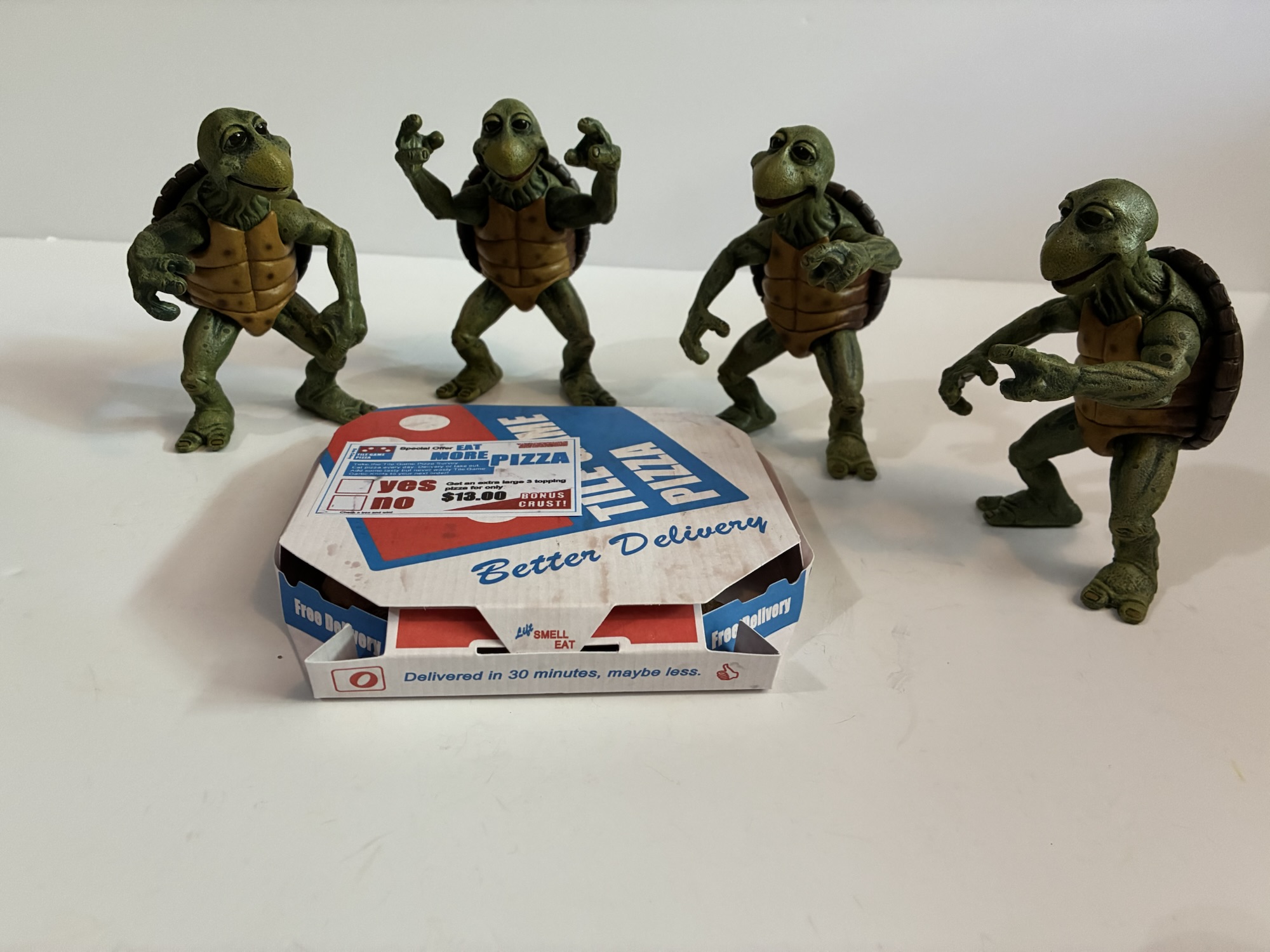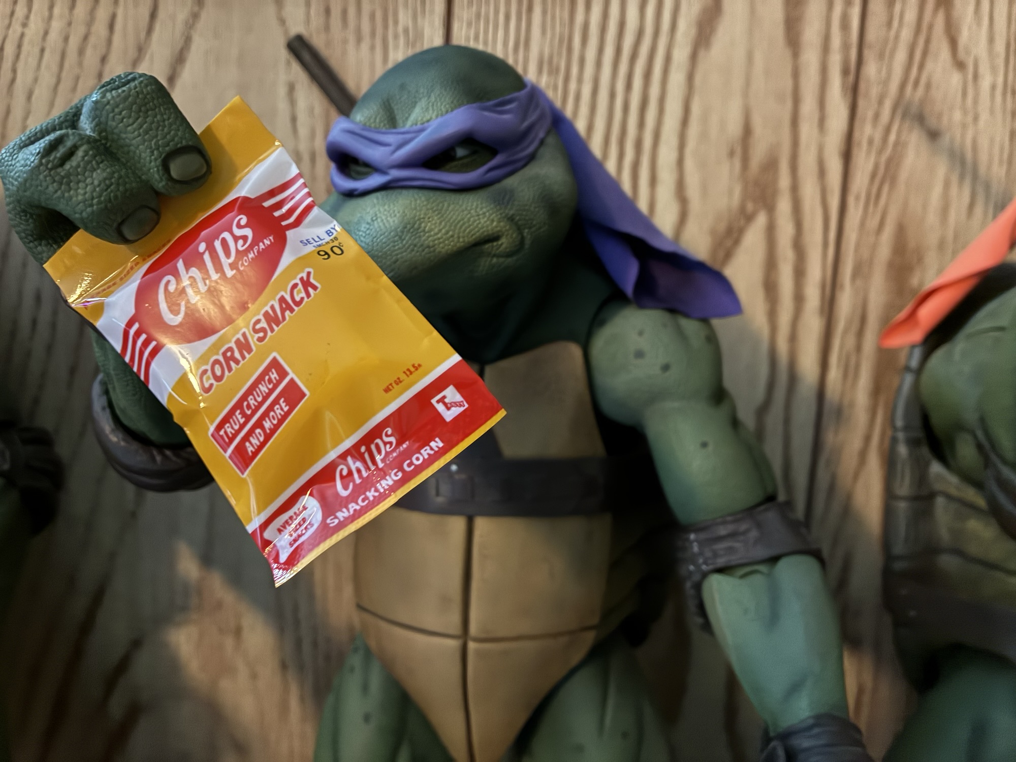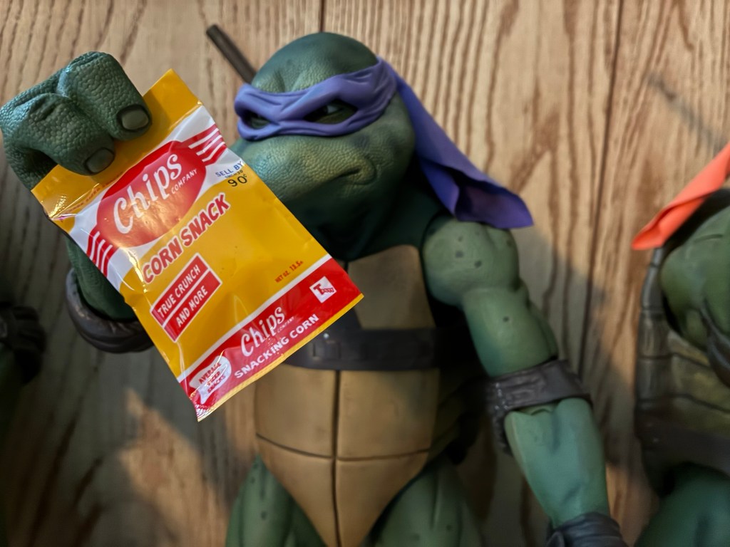 The pizza box and food items are what they are. The box is designed to look like a Domino’s box, but it’s parody. The grease marks inside are convincing and I like that the price is listed as $13. The four slices of pizza are actually different sculpts from what came with the turtles. That’s pretty cool as it gives a more realistic look, but also probably wasn’t necessary. The new slices appear a little darker than what came with the boys, but it will work. The toppings at least match. The corn chips are done just like the pork rinds so it’s a foil bag sealed at both ends. There’s probably a little piece of a spongey material inside to give it some volume, but it probably could have done with a touch more. The turtles can grip it easily and that little scene with Mikey and Don at the table was perhaps the one my sister and I recreated the most as kids, though always with potato chips as we never had pork rinds.