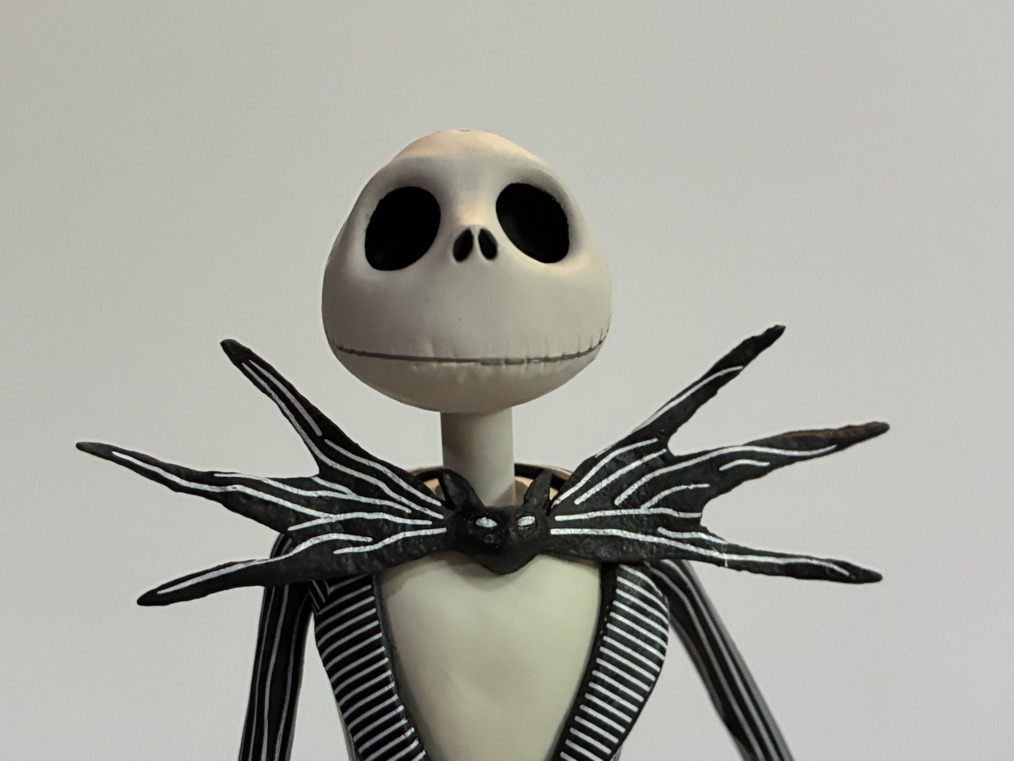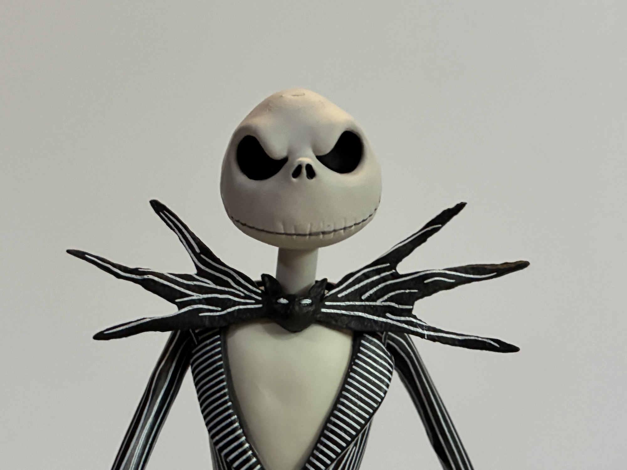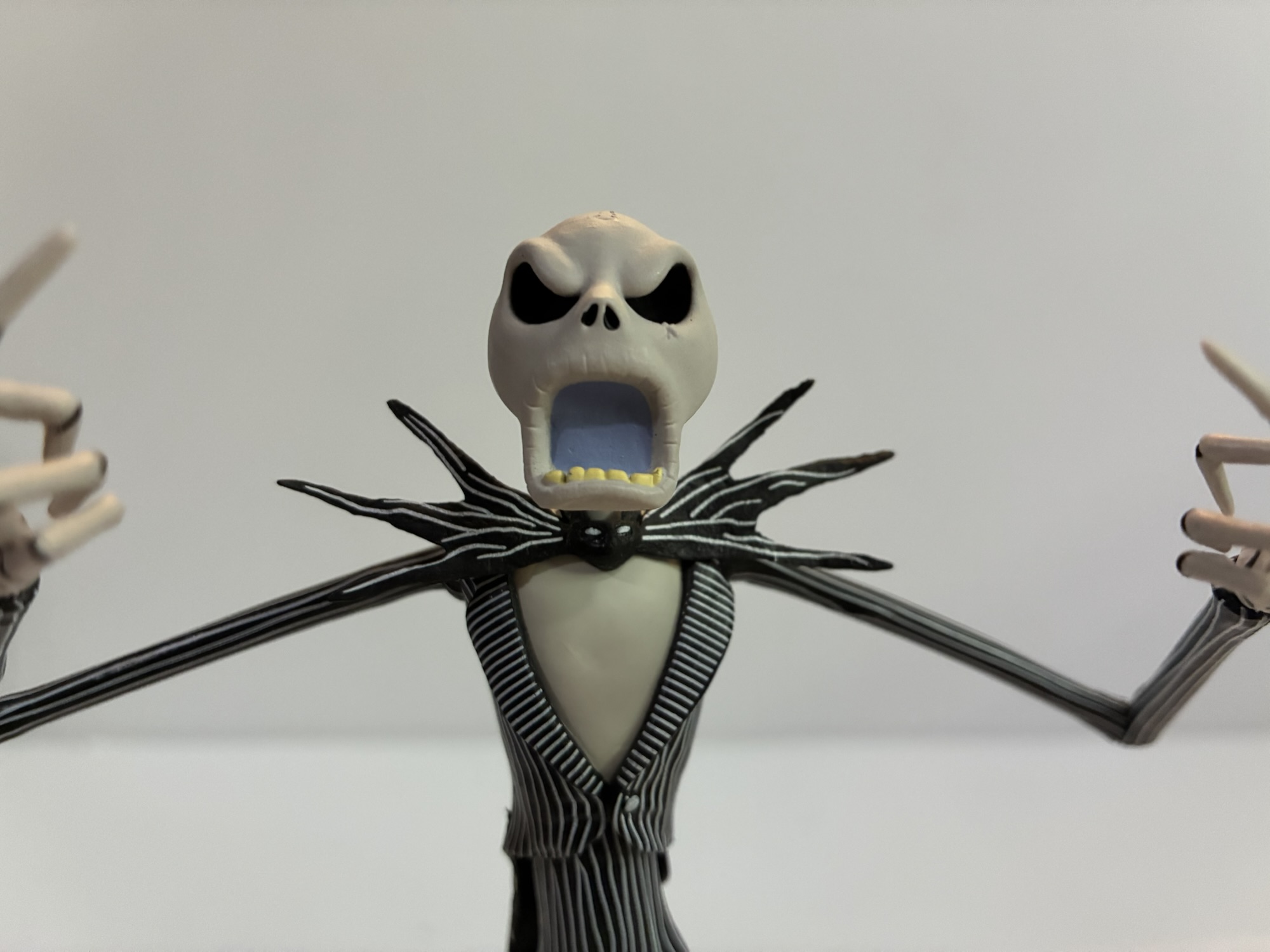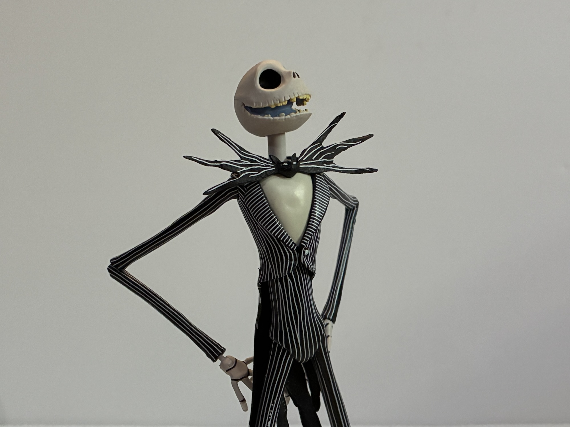 And speaking of, that head is magnificent. They all are, actually. NECA really captured the look of Jack with each and every portrait in this box and it’s what sells the figure. By default, we have a smiling Jack portrait but there’s also a mischievous grin, an open mouthed smile, angry smile, a look of wonderment, an “Ooo” mouth, a scared portrait, and a howling one. That’s eight total portraits, if you weren’t counting, and you practically have enough to do your own stop-motion with this figure. There’s also four sets of hands to add to the expressive nature of the figure and they are relaxed, pointing, gripping, and I guess what I’d consider clawing. He doesn’t have a tight gripping hand, but aside from that I can’t think of anything that’s really missing. Some of the heads are better than others when it comes to paint, but mostly to how the head was extracted from the mold. My howling head has a blemish by the left eye and a couple of them have little divots in the top of the skull. They should hopefully be visible in the pictures.