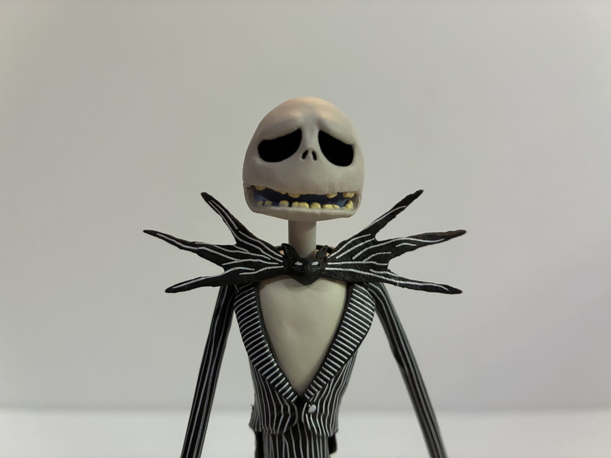 Jack comes in the standard Ultimates style box with artwork on the front and photography on the sides and back. There’s no credit for the artwork so I assume it’s from Disney. It certainly looks nice if you’re an in-box collector, but I am not. Once Jack is removed from the box he’ll stand around 8.25″ to the top of his head. He’s composed entirely of plastic with no soft goods at all. The plastic is also fairly rigid including the tails on his coat and his bow tie. The proportions look spot-on to the source material with incredibly thin, long, limbs. The body looks like it’s all black plastic with white lines painted onto it for his tuxedo. There’s an intentional wiggle to those lines reflecting the look in the film and I almost wish I had two figures to compare each other to see if there’s a random element to the shape of the lines or if this is taken from the film. The application isn’t perfect. There’s some messy paint on the right thigh of my figure that I lament not noticing at the store when I picked this guy up as I had a few to choose from. The backside of the coat tails also aren’t painted, or if they are it’s a touch glossy and I wish it were matte. The white of the hands and the chest are clean as is the head.