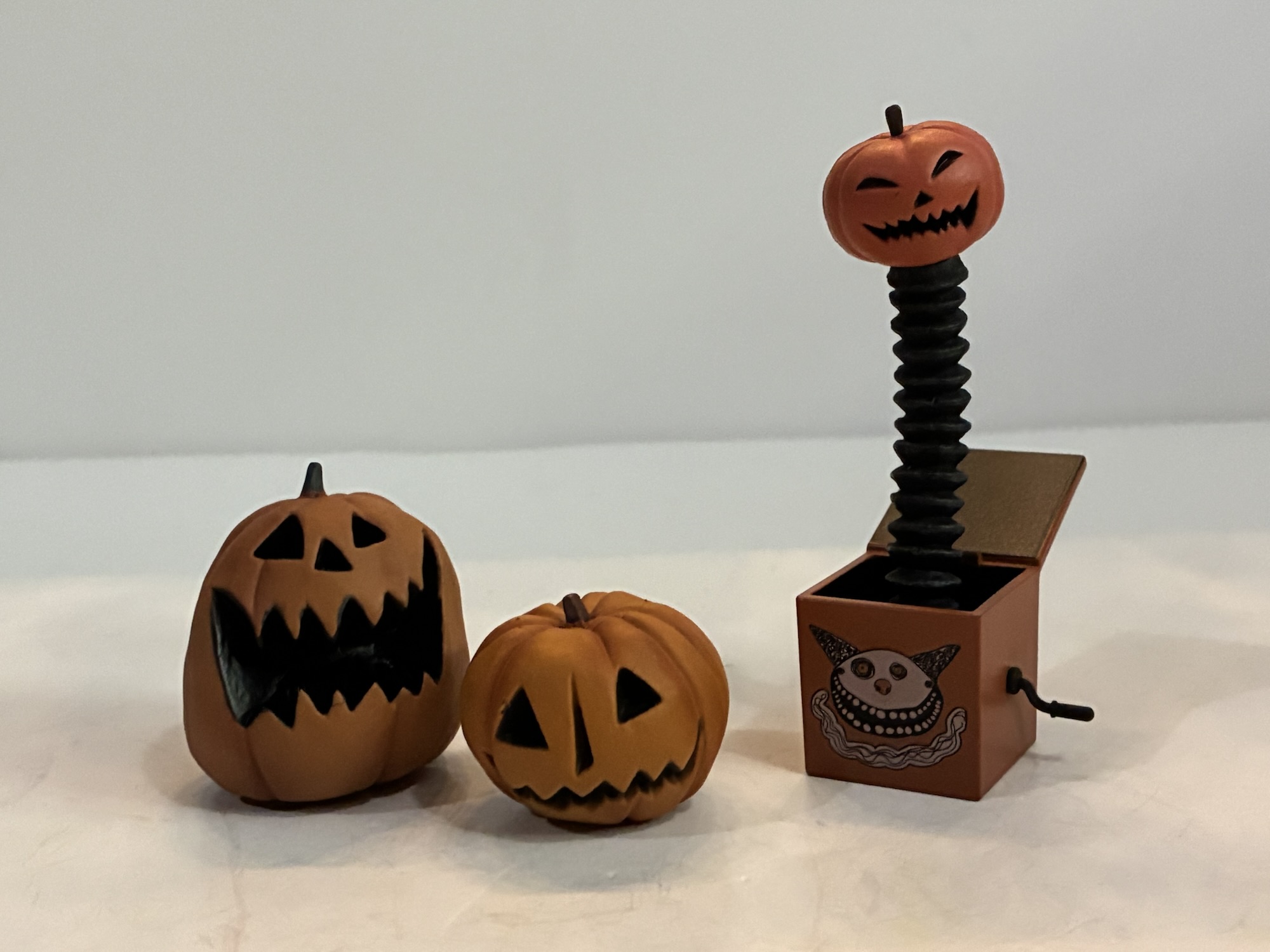 We have a few other accessories to talk about including the best, little, ghost dog around: Zero. He’s sculpted in this milky, translucent, plastic with a nicely painted jack-o-lantern nose. His head rotates, but that’s all for articulation. He does come with a transparent ball-socket stand that gets the top of his head about 3.5″ off the surface if you’re keeping him parallel with the ground. You can tilt and move him about on the stand and it’s a solid way to pull off Zero. I wish the plastic had more of a blueish hue to it instead of a yellowish one, but I’m happy we got a Zero with Jack. The other accessories include a pair of jack-o-lanterns, the jack-o-lantern jack-in-the-box (that’s a lot of hyphens), and the framed picture of Jack holding yet another jack-o-lantern (he is the Pumpkin King, after all). Lastly, there’s a clear, oval, stand for Jack that works only so well. It has two pegs on it, but I’ve found if I actually use both pegs that Jack will fall over eventually. The jack-o-lanterns help here because they have some weight to them so you can plop on the stand to help stabilize things. I think it works best to only use one foot peg on the stand and turn it so it’s pointing out from Jack for a little more coverage that way, though given the proportions and tiny feet in play here, this is a figure that’s never going to be 100% secure on your shelf. He really needs more of a doll stand to grab him at the waist. Just be mindful with where you leave this guy on a shelf.
