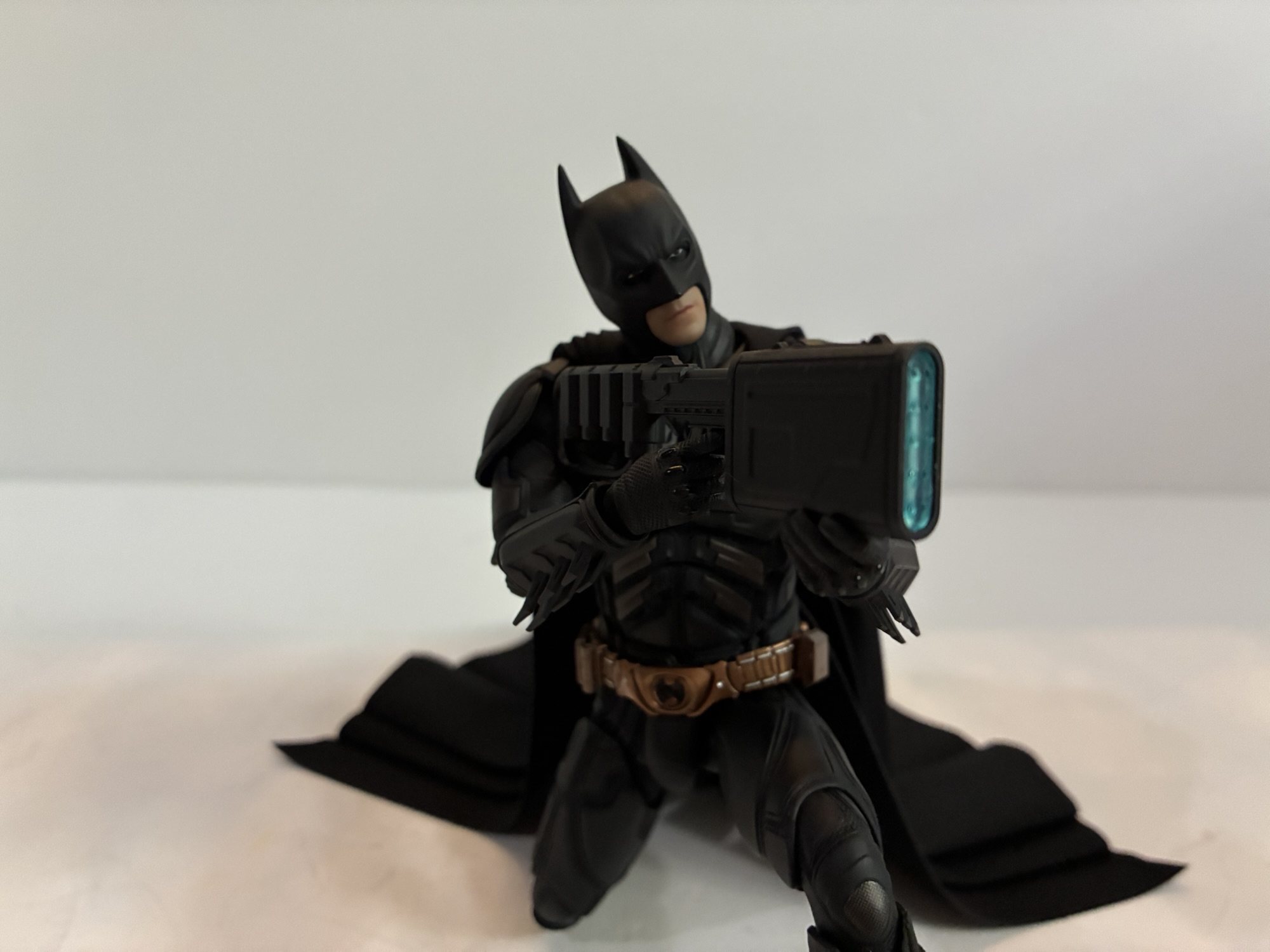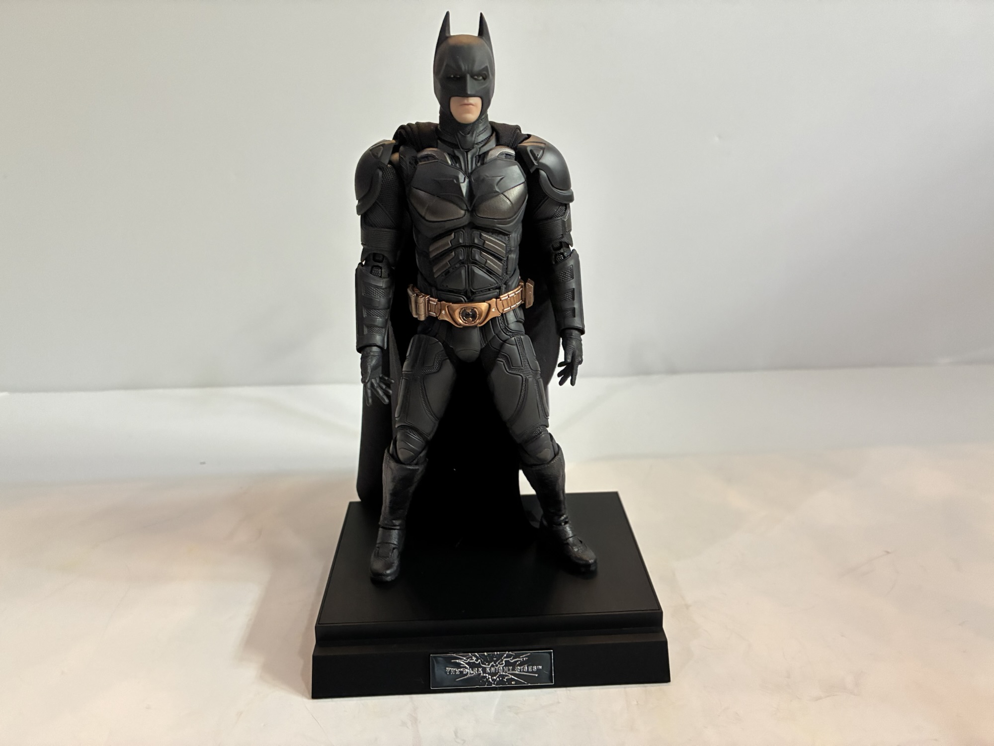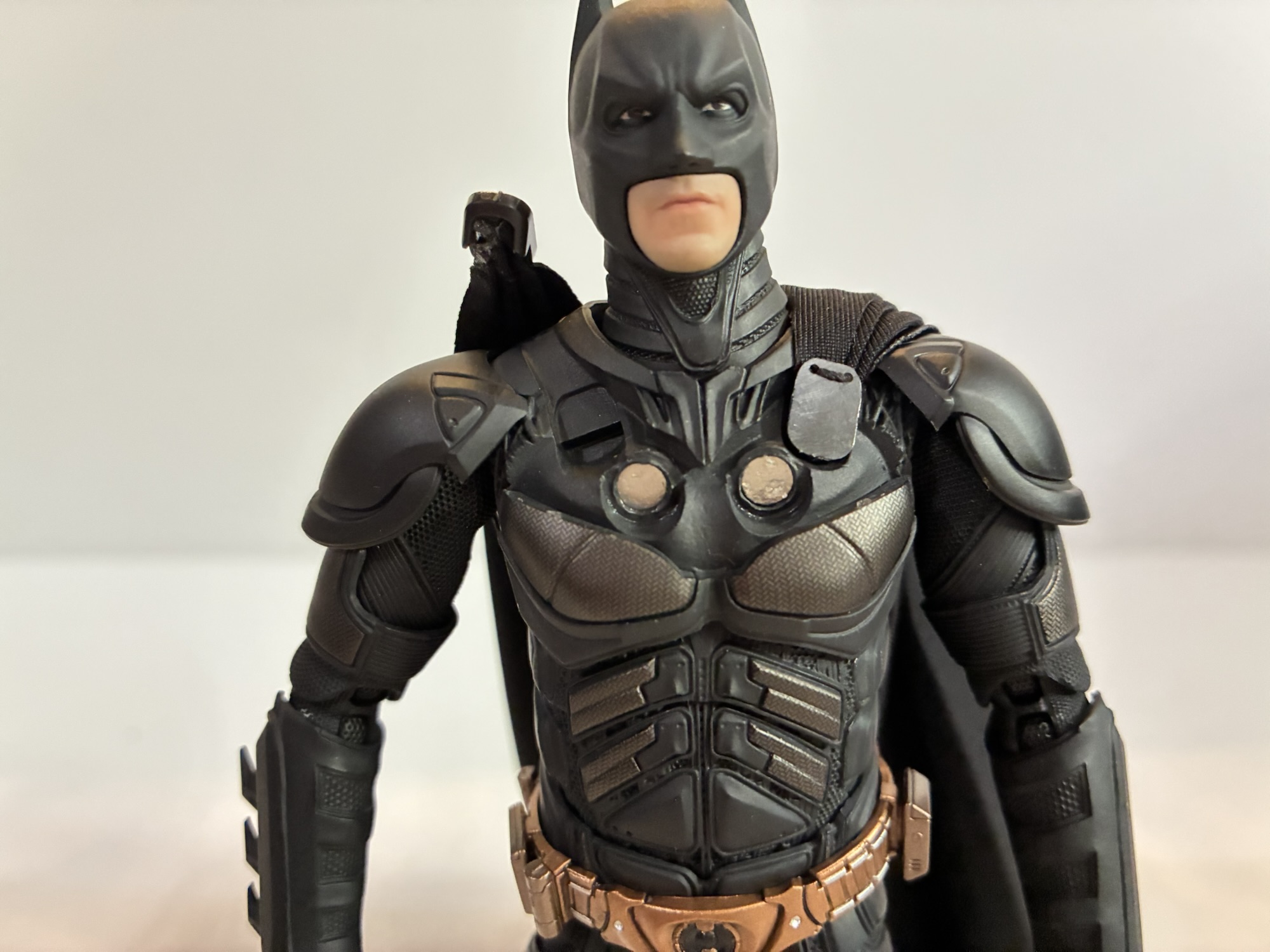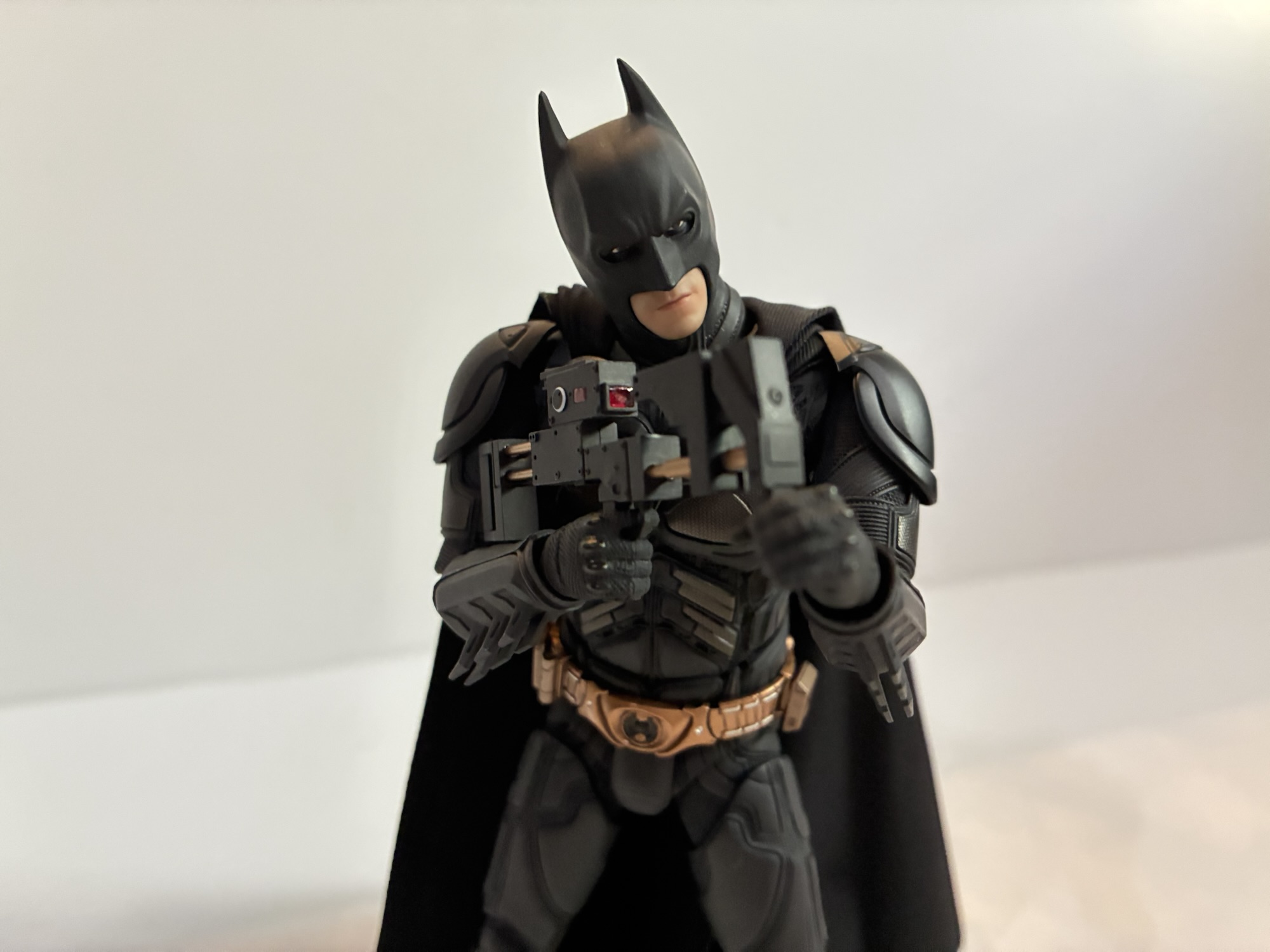 Batman is outfitted with a bunch of accessories, most of which are good. What’s not good are the optional faceplates. There are three included and there is barely any difference between them. They’re fairly neutral, but I’ll post pictures and maybe you can spot the difference. For hands, we have sets of fists, open, sticky bomb gun holding hands, relaxed, EMP rile supporting left hand, EMP rifle trigger right hand, Batarang holding right hand, Grapple Gun holding right hand. As you could have probably guessed based on those descriptions, we also have a grapple gun, EMP rifle, sticky bomb gun, and four Batarangs: two large, two small. The guns all look pretty damn good. I think the sticky bomb gun was featured in The Dark Knight, and it may have reappeared in The Dark Knight Rises. There’s nice detail on all of the guns and the finish is really nice on the matte parts and the copper parts. The hands are as advertised and work very well for their intended purpose. The figure does have some difficulty in looking down the barrel of the guns, but it can be fudged. There’s also the unmasked portrait which features a neutral expression and a terrific likeness to Christian Bale. It connects at the lower neck peg and doesn’t feature any articulation where the neck meets the head, which is a little odd. It was a bit tricky getting the standard neck part off and I did resort to hot water to do it. The peg inside is pretty sturdy though so I probably could have bent back and pulled. The display stand is pretty hefty and has a shiny plate on the front featuring the film’s logo. The armature included is pretty standard and works well.