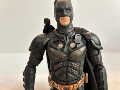 The Batman figure comes without the cape applied. It stands just a tick over 6″, and considering that Christian Bale is listed as an even 6′ I’d say that’s some pretty damn good scaling if you figure the boots would have bumped him up an inch or two. What attracted me to this release is that the body construction is all plastic. It’s a mix of PVC and ABS and there’s no rubber overlays in use. It has a very light feel in hand, similar to a MAFEX figure, and the quality is very nice. The finish is matte and per the instructions it is painted, though I’m guessing this is all black plastic. There are different textures at play as there’s some parts that feel like Kevlar and some parts that are smooth. The torso is all segmented, but the pieces are fit together very well. The proportions look great and the copper colored belt looks pretty screen accurate to me.