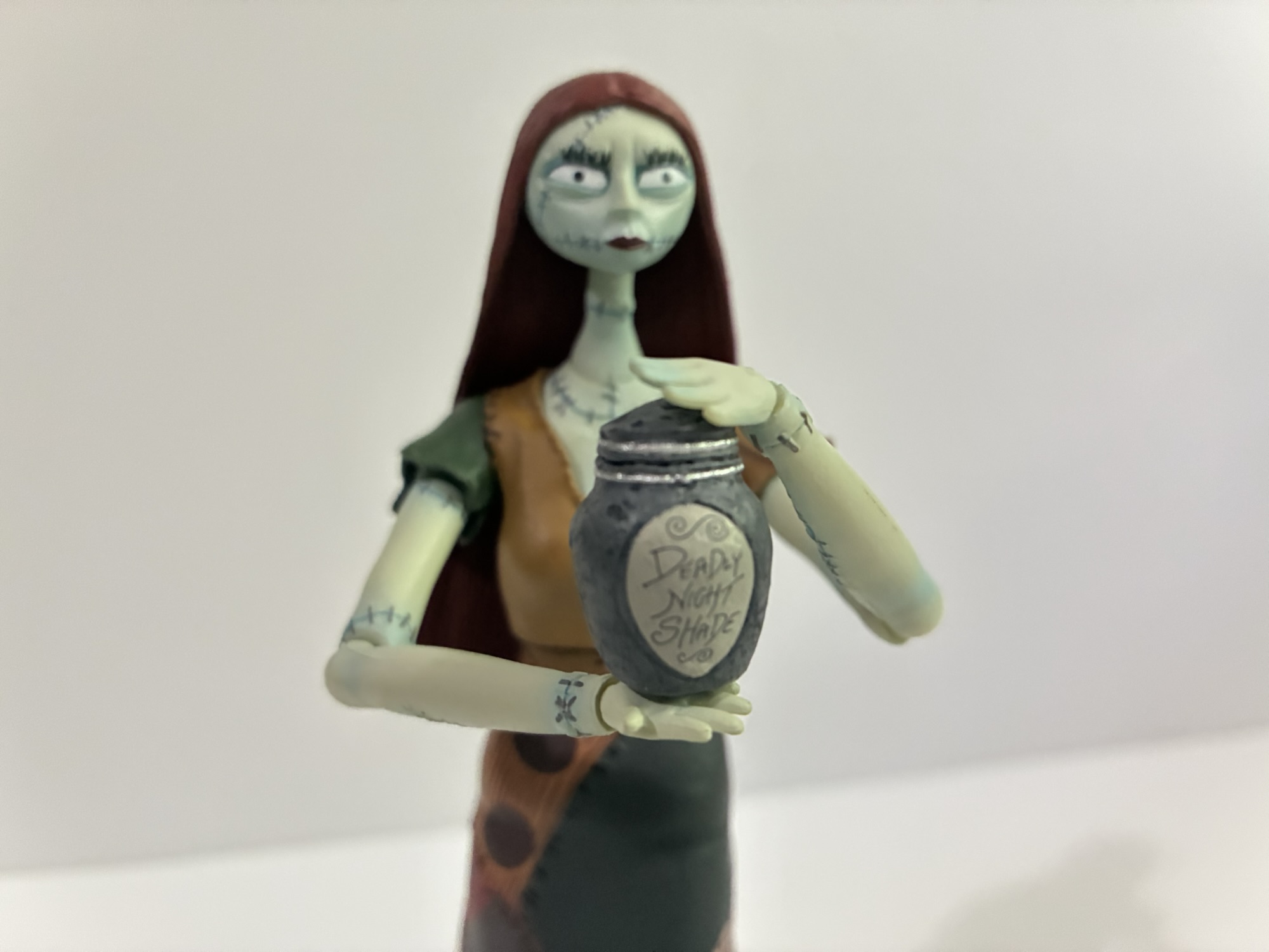 Sally’s articulation is pretty basic as well as pretty restricted given the character design. She’s composed entirely of plastic, no soft goods, so the dress is going to prevent her hips from doing anything. She does have a ball joint at the head and at the base of her neck so she gets decent range there. Her hair is a long sheet of plastic so it gets in the way a bit, but not enough to stop her from being able to look her beau in the eye…sockets. Shoulders feature ball-hinges, elbows are single hinged with a swivel, wrists rotate and hinge. There’s a diaphragm joint that offers a little tilt, but it mostly works for rotation. Knees are single-hinges and the ankles are hinged and do feature an ankle rocker, but her feet are so tiny it can be hard to use. Articulating her feet feels like wiggling a loose tooth.
