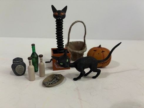 Sally’s other accessories are mostly tailored to her time in her tower and some other odds and ends. She comes with the basket she brought to Jack when she worried he wasn’t taking care of himself (does a skeleton really need to?). For contents, there are two white bottles one marked with an S and the other P which makes me think salt and pepper, but it would be odd to have those in bottles, no? There’s also a translucent green bottle which is from the movie. Sally also comes with her slotted spoon and the jar of deadly night shade. The jar has some really nice texture and paint work on it to the point where I expect it to feel like a true ceramic every time I pick it up. The black cat is also along for the ride and he has a little plate with fish bones on it. The cat is articulated at the head and no where else. Sally also has a jack-in-the-box with a black cat theme to it as well as a smiling jack-o-lantern. Lastly, she has a stand just like Jack’s which you will need since her feet are so tiny. She stands okay with it, but I did have her take a shelf dive the first night so do be careful.