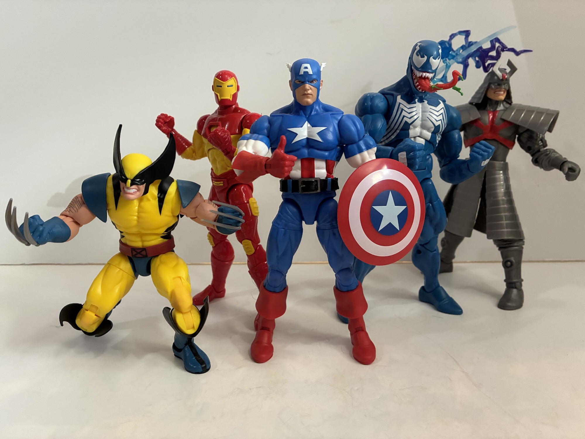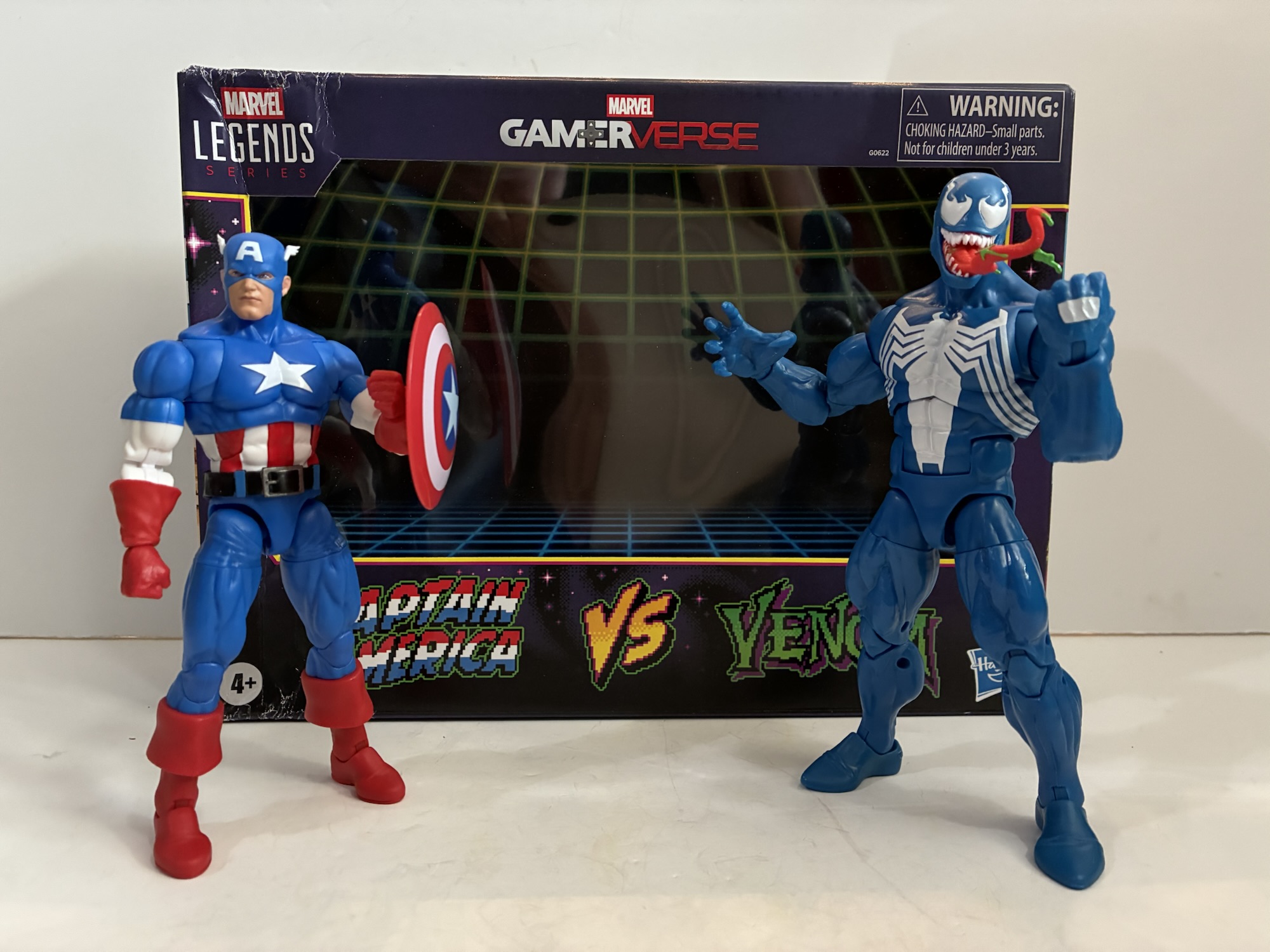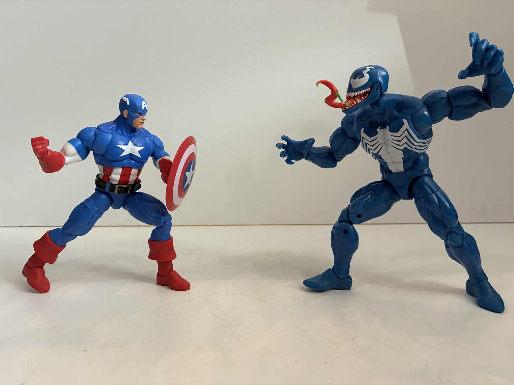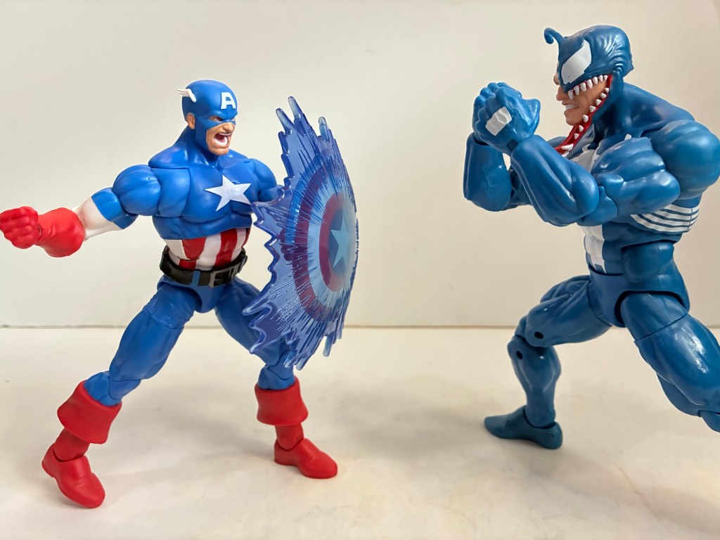 We’ve already looked at one release in this series which was the excellent Wolverine and the not so excellent Silver Samurai. The draw for me with that set was the all new Wolverine that quite resembles his sprite from the Marvel vs Capcom series of games. With this release, we get a very familiar Venom and a not so familiar Cap. I’m a Venom fan so I’m always a little tempted whenever a new one comes around and this being Hasbro’s first blue Venom did catch my eye, but I was willing to pass. As for Cap, I’ve never been a Captain America fan. He was one of the lame heroes of my youth and I only remember one kid who actually liked the character. On the other hand, I do like blue and when you have a hero with a lot of blue that gets my attention and this Cap very much got my attention. Not to the tune of $60 though, or whatever the MSRP was when this thing landed at retail. Then Target had some sale and I had reward money when this thing was in-stock at my local store making my price a whopping $16. For $8 a figure, basically 2005 Legends pricing, you’re damn right I was willing to take a look at this one.