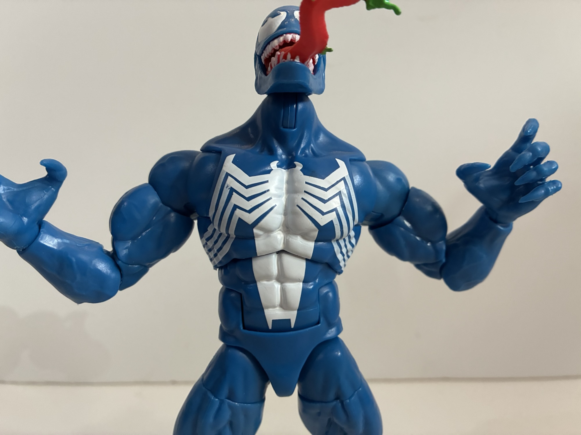 What obviously stands out most though is the color. This Venom is a light blue which is fairly similar to the in-game sprite. Venom, for a long time, was always colored blue in the comics and shaded with black as comic artists often do for characters that wear all black so I’ve always liked this blue look for him. My ideal would be a darker blue that’s shaded like the art of Mark Bagley, but this is still neat to see in figure form. The default head is the Eddie head in mid-transformation which I think originated in a 3-pack. The symbiote section is new sculpt to better match the look of this version and the overall look is actually pretty impressive. The alternate head is a Venom with his green-drool covered tongue protruding. The severe underbite and shape of the eyes is very much evocative of the game art, though thinner and more elongated than the actual sprite. The only negative with the presentation is the little used white paint. The opacity of the spider logo is fine in the middle, but the legs are too thin and a lot of blue pokes through. The paint for the eyes is hardly pristine and the white paint on the hands suffers from the same opacity issues, though not as severe as the spider legs. We might as well get the accessories out of the way now too as he only comes with two clawing hands and two fists.