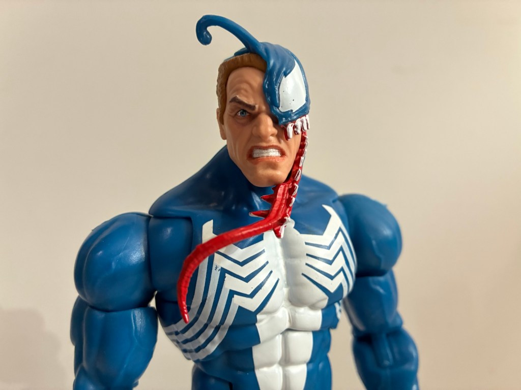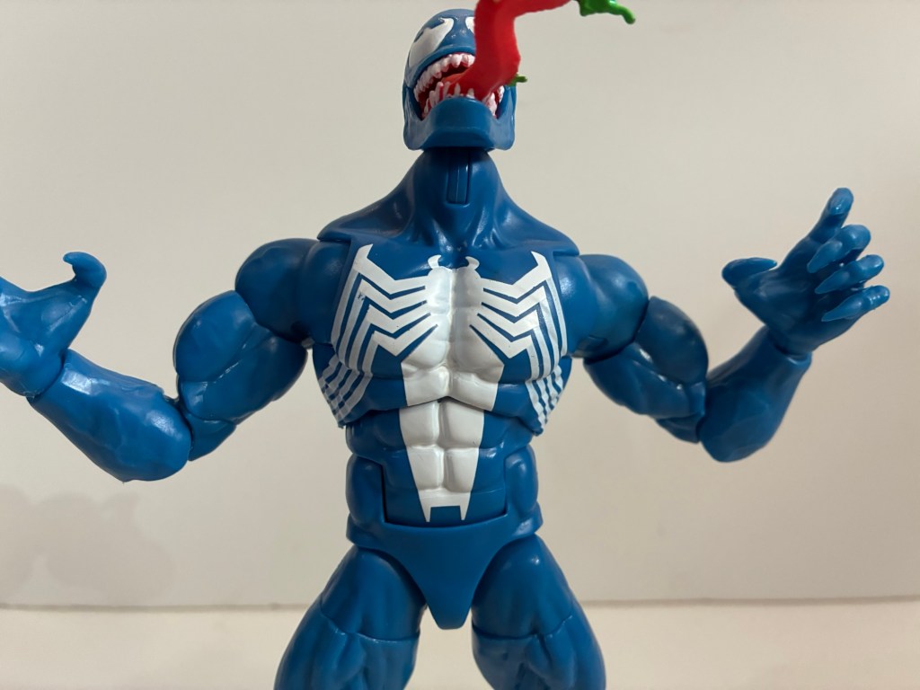 Let’s get Venom out of the way first since he very much resembles 2024’s Walmart exclusive retro-card Venom. At least, at first blush. The only parts this figure actually shares with that one (and other Venom figures) are the legs and hands. The torso and arms have actually been redone as this one goes with the old hinged-ball peg setup at the head. The musculature is slightly different, less vascular, and he has pin-less arms and no veins around the forearm. Like the animated Venom, the spider logo on the back has been squished to fit inside the butterfly joint which is fine while the logo on the front more comfortably fits inside the same joint. The shoulders are bigger which makes a big difference with the silhouette making this the best Venom body Hasbro has done. It’s just a shame they didn’t make the legs pin-less to match. The new torso does make this Venom slightly taller than the old one as he stands at about 7.125″ to the top of his “masked” head.