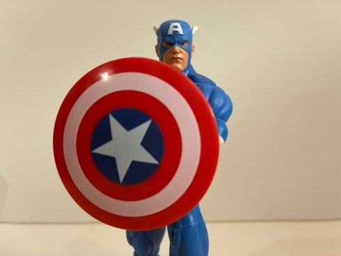 The paint and colors are mostly okay as well. I already said I love this blue and it’s largely colored plastic. There is a slight variation between the blue of the chest and the blue of the arms. In most lighting it’s barely noticeable, under brighter lights the arms are noticeably lighter which also includes the portion of the chest comprised by the butterfly joints. The paint on the face and head is pretty good as is the paint on the abdomen. The white star on the chest suffers some of the same issue as Venom with the opacity, but it’s not as severe an issue. The gloves and boots are molded in red and possess a nice, matte, finish. The only visual issue I have with the figure is that the wings on the sides of his head are not perfectly symmetrical. It’s minor, but also one of those things that once seen cannot be unseen.