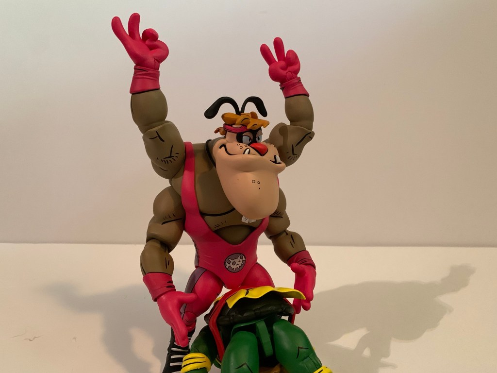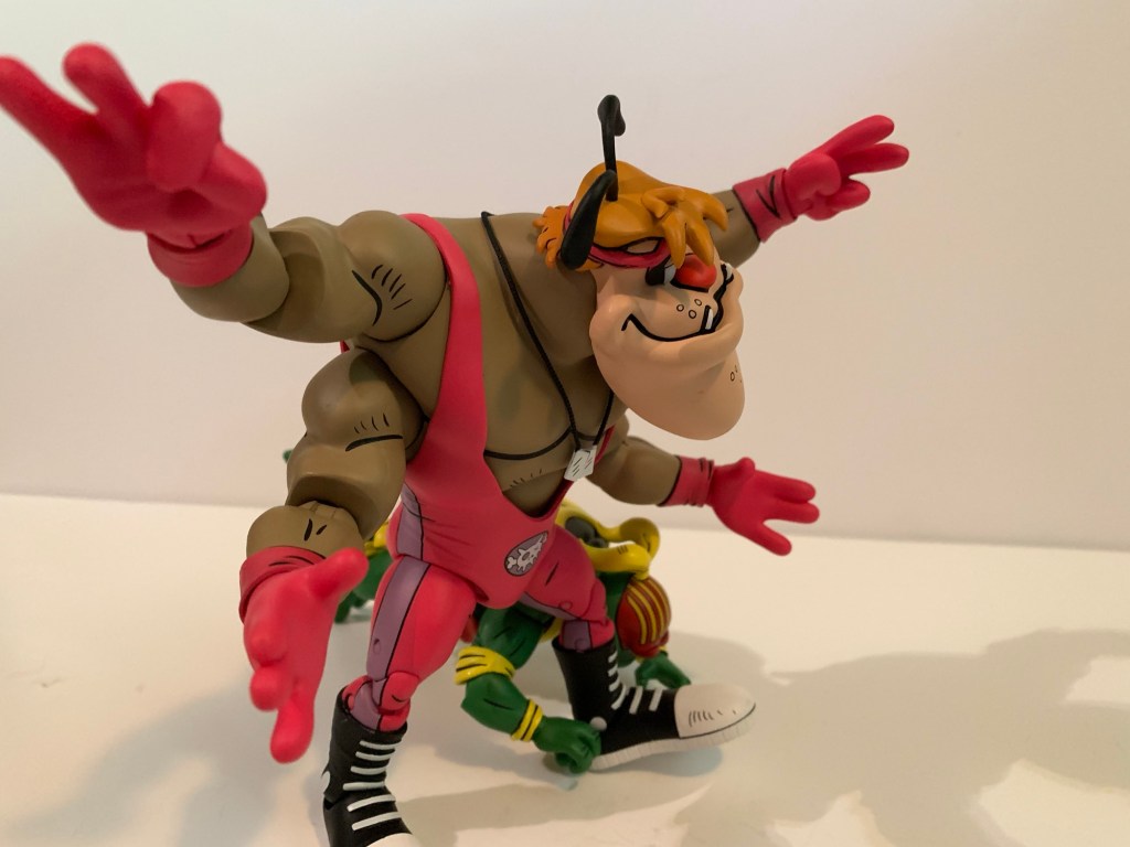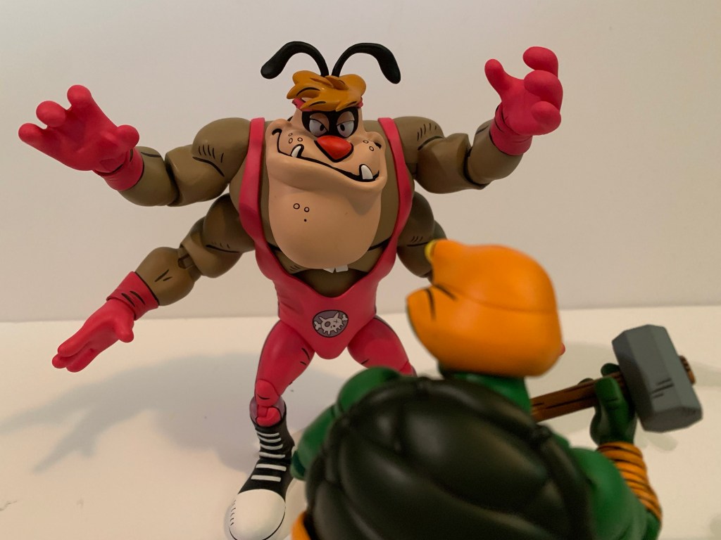 NECA’s TMNT Adventures line of action figures has been committed to giving fans basically everyone associated with the fictional Stump Wrestling. We have the turtles, Leatherhead, and Cryin’ Houn’, and now we have Ace Duck. This version of Ace is quite different from his Playmates counterpart. The only things the two share are the fact that they’re both ducks and they both have wings. While the original Ace is of average build for a human, this duck is massive. The phrase beefcake comes to mind, but also feels inappropriate for the massive mallard since he’s not a mammal. He’s a big boy and would have fit right in with the WWF of the early 90s. Even the whole duck thing probably could have worked in the promotion that introduced the Gobbledy Gooker. He also has a bit of a Buddy Rogers thing going on as he’s kind of a pretty boy. Part of me wonders if this design was influenced by Daffy Duck’s foil in the short Muscle Tussle because even the trunks are the same to go along with the physique. As a character, he’s neither friend nor foe to the turtles and even though he’s depicted as champion, he sure seems to lose a lot.
