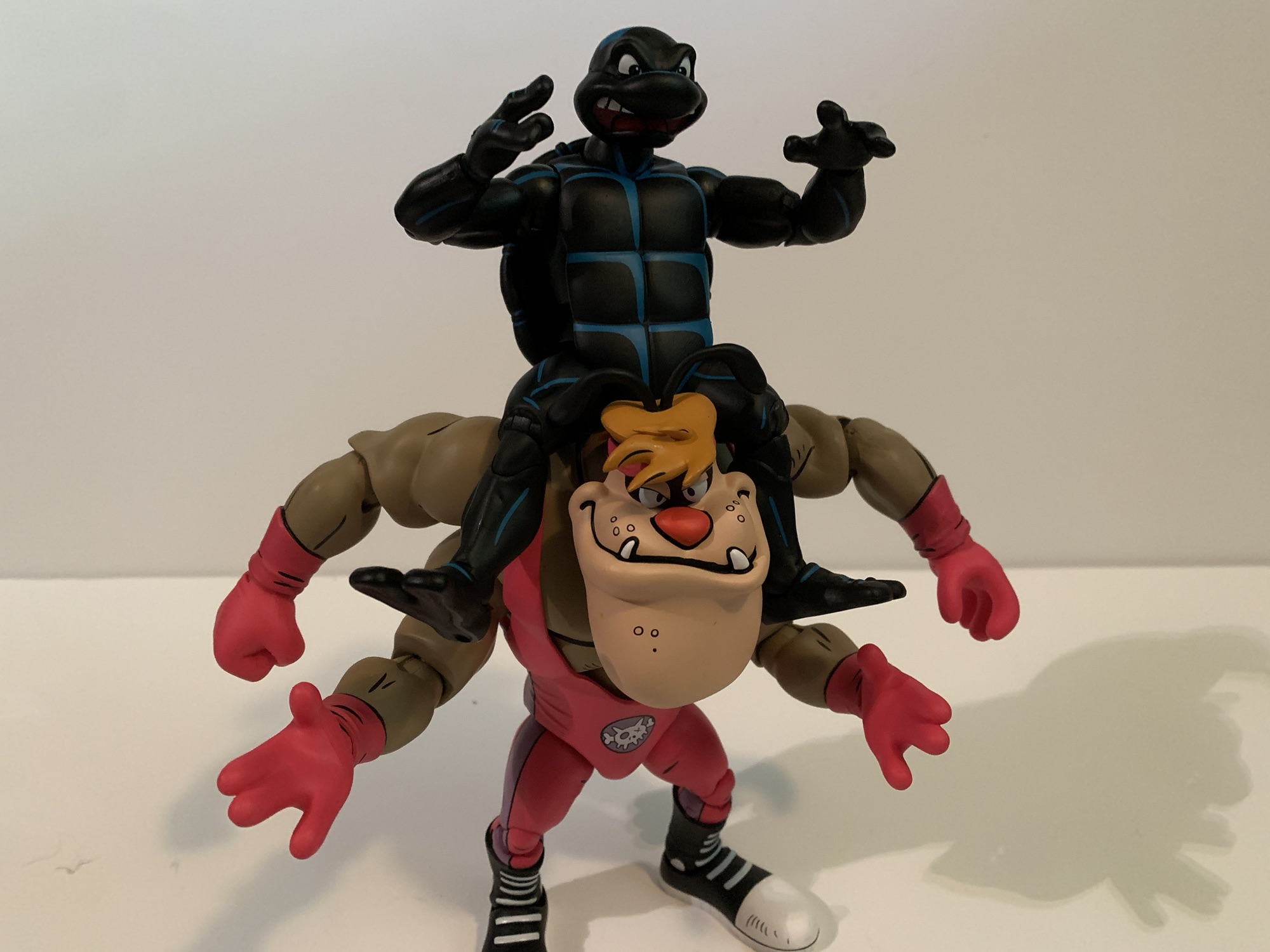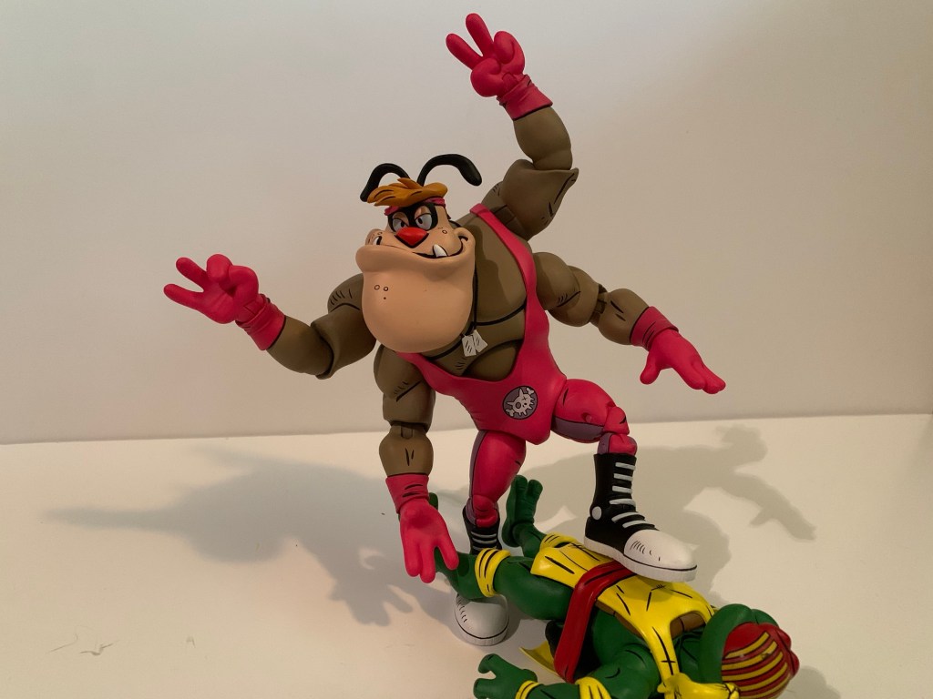 Cryin’ Houn’ is not going to do much on your shelf beside stand there and look imposing. As such, he’s like a true monster wrestler, the sort of big man that really didn’t do a whole lot in the ring either. He’s meant to remain vertical when going on the offensive with punches, elbows, some eye pokes, and little else. He can’t even get his leg up for an effective big boot and his arms can’t cross his chest at all so no chokeslams. I guess he can do a one-handed chokeslam. He’s also not designed to take abuse either so he’s basically one of those big guys who doesn’t sell his opponent’s offense. A tough draw for the turtles.