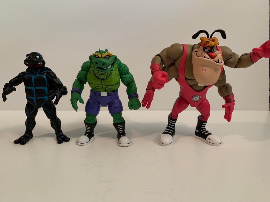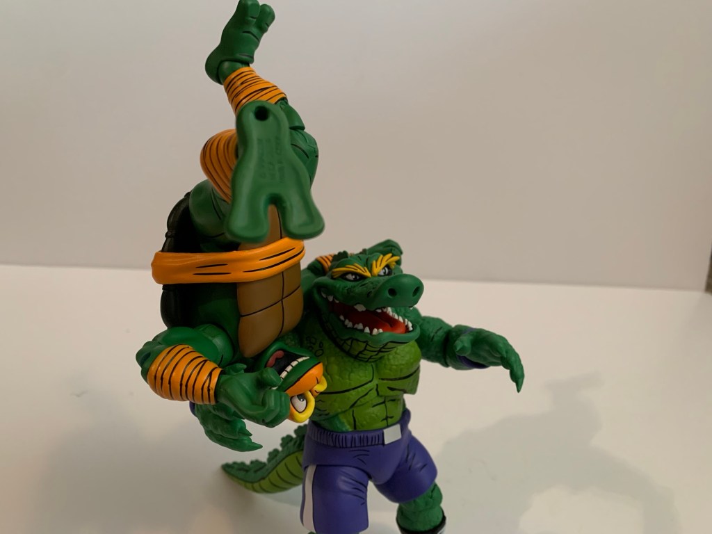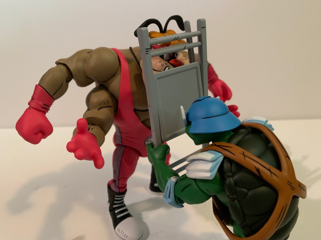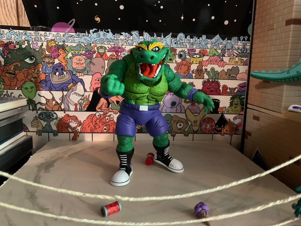 And maybe that’s what makes him expensive, because it’s certainly not the plastic. Leatherhead doesn’t come with much in the box, just two extra sets of hands leaving us with fists, gripping, and open. Why does he have gripping hands? I don’t know because it’s certainly not to hold any included items because there are none. He only has the one portrait, which is a bit of a bummer since he seems to have a pretty expressive few panels in the comics. My criticism of this release is basically the same as Cryin’ Houn’ which is to say I think NECA could do better. They already have tooled some wrestling weapons, so why not stick them here? We could always use more chairs. A break-away table would have been pretty rad, even if no such thing took place in the books. Wrestling figures should be fun to design because of all or the shenanigans that can go on in and out of the squared-circle so it’s disappointing to not see NECA take advantage of suck.