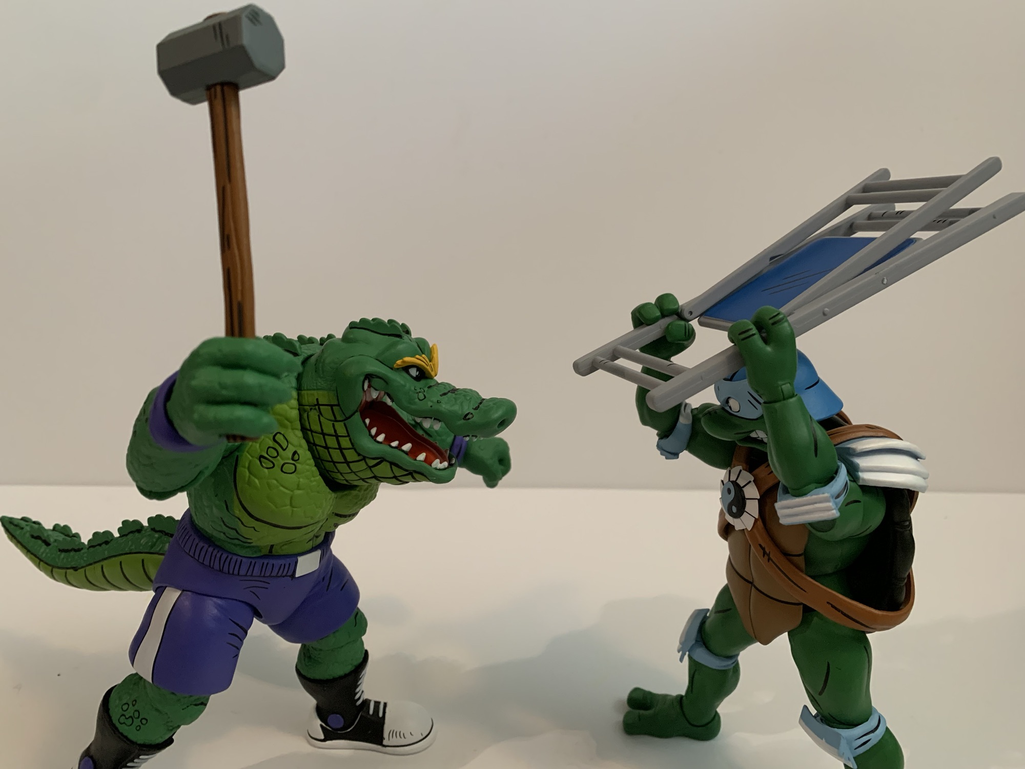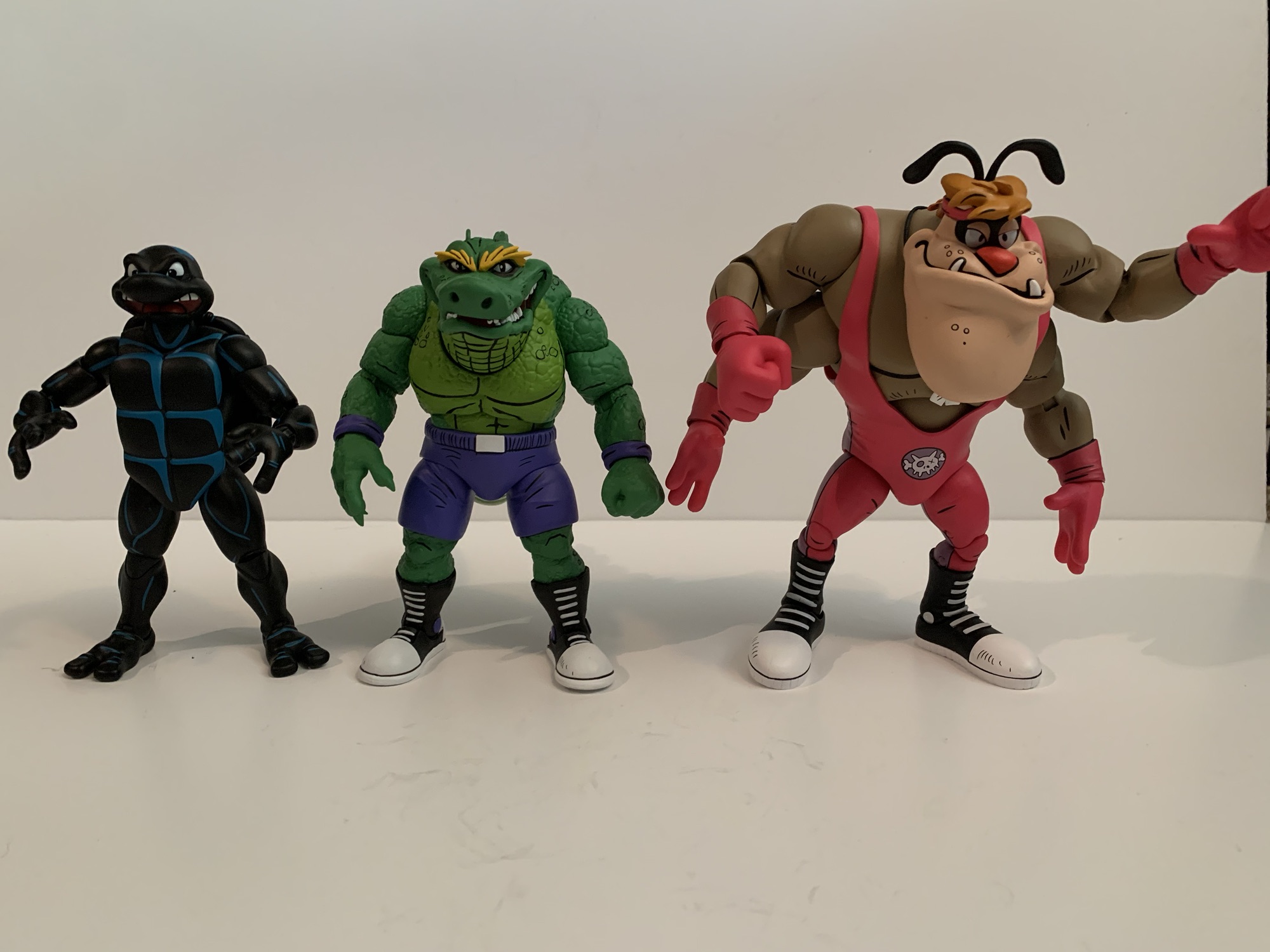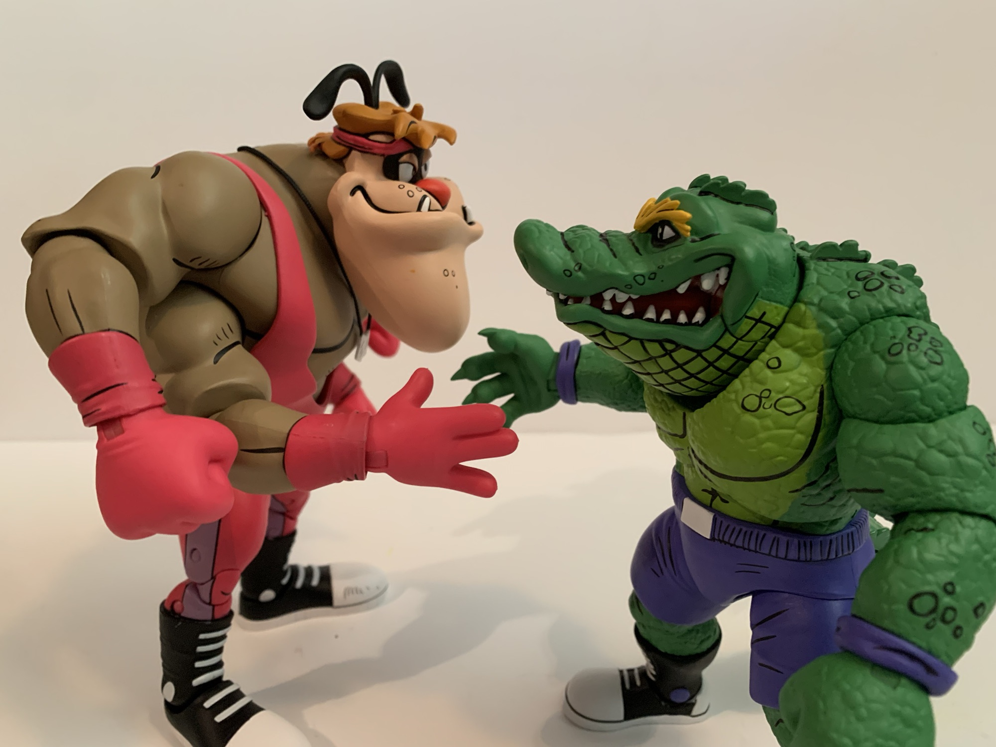 And maybe that’s what makes him expensive, because it’s certainly not the plastic. Leatherhead doesn’t come with much in the box, just two extra sets of hands leaving us with fists, gripping, and open. Why does he have gripping hands? I don’t know because it’s certainly not to hold any included items because there are none. He only has the one portrait, which is a bit of a bummer since he seems to have a pretty expressive few panels in the comics. My criticism of this release is basically the same as Cryin’ Houn’ which is to say I think NECA could do better. They already have tooled some wrestling weapons, so why not stick them here? We could always use more chairs. A break-away table would have been pretty rad, even if no such thing took place in the books. Wrestling figures should be fun to design because of all or the shenanigans that can go on in and out of the squared-circle so it’s disappointing to not see NECA take advantage of suck.