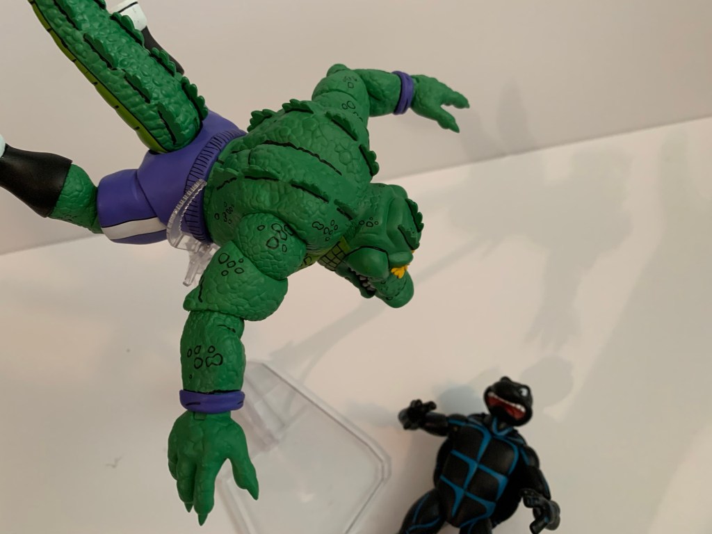 Articulation for Leatherhead is not particularly impressive, though it’s not really a strength of the line either. He does have a double-ball peg for the head, but since it sits so low on the chest there’s not a lot he can do with it. He can look side to side okay as well as down. There’s a little range looking up, but the head has a tendency to pop off of the ball peg when doing so. The mouth does open and close which helps to make the figure a bit more expressive. Shoulders are simple ball hinges which rotate fine, but can’t quite raise out to a “T” pose or come all the way down at the sides of the figure. There is a biceps swivel as well as a swivel and single hinge at the elbow. Leatherhead can straighten his arms out there and just about hit a 90 degree bend. Wrists swivel and hinge horizontally.