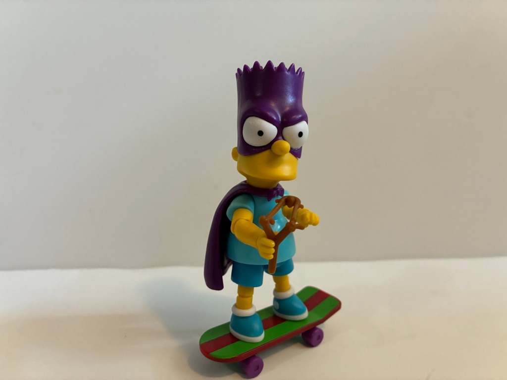 Let’s start with Bartman since he’s the most familiar. This is basically the same Bart figure from the first wave, but with a new head, cape, and slingshot. He’s sporting the blue t-shirt which is what Bartman usually was drawn with as he was more of a licensing art character than a show one. The new head has a scowl on it befitting the character and it looks like it’s molded in two main pieces: the cowl and the lower head. Jakks sticks with colored plastic and avoids paint which is true of Bartman. His left hand has also been replaced with a fist when compared to regular Bart which helps to sell the illusion that he’s drawing his slingshot (which is held in his canonically correct right hand as Bart is a lefty). The cape is just plastic, but looks okay. You just can’t position it at all which kind of stinks since he does come with a skateboard. And that skateboard is the exact same one that comes with regular Bart. If you like that Bart then you’ll probably like Bartman. He has all the pluses and minuses of that release, but with a cool superhero motif.