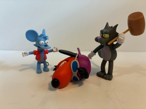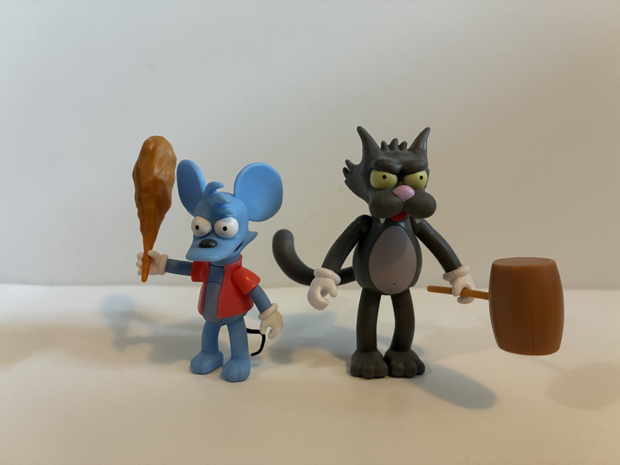 I have two more characters to highlight before we’re done and they come from the 2.5″ line: Itchy and Scratchy. These little guys feel right at home in the smaller scale so much that I don’t think I have any interest in 5″ versions. They have the same limitations as Bart and Lisa which is no elbow articulation, knee, wrist, waist, and their legs move as one piece. Still, the sculpt looks great on both and they actually feature a solid amount of paint. Itchy comes with a club while Scratchy comes with a mallet. The limited articulation means they can’t do much with their accessories, but they look good in a pretty vanilla pose. It would be awesome if at least Scratchy could be pulled apart with gruesome wounds left behind, but Jakks is probably hoping to court some kids with this line so I get why that isn’t the case.