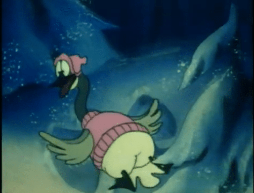 Peter and Lucy run off into the woods and while the animation isn’t doing much for me, I will say the setting looks appropriately cold. Cold enough that I catch myself telling Peter to just go home assuming he has a home. He clearly is short on friends since he hangs around with a goose in pajamas. It’s time for a musical montage where we see Peter and Lucy doing winter things like making snow angels and looking at the stars, which is appropriate as the song would seem to be called something like “Why Don’t They Look to the Sky?” At least, the vocalist punctuates every verse with that question. I suppose now is a good time to mention that the music is credited to Sylvia Tyson and since the vocalist is feminine sounding, it may even be her that’s singing.