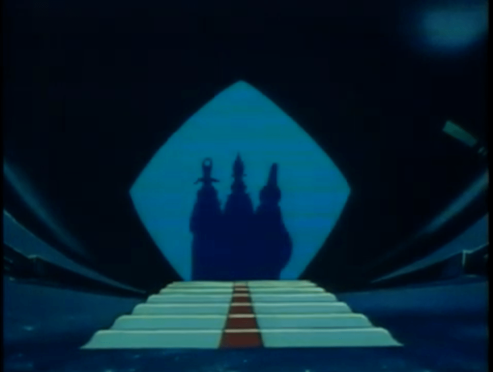 The song ends with Peter and Lucy coming upon that light again, only now it’s descending closer and closer to the Earth. There’s an actual attempt at lighting as this thing turns into a sphere. It’s probably the closest thing to special effects as we’re going to get as this circular object lands. It has an almost realistic texture as if this were a model, but it’s still very flat so if it is then it’s just paper. It turns all black and then the outline of a pentagon with rounded corners appears. It then falls like it’s made out of paper before forming into stairs. A pretty horrid sounding bit of synthesized music accompanies this dramatic reveal as the silhouettes of three tall individuals materialize in the glowing light.