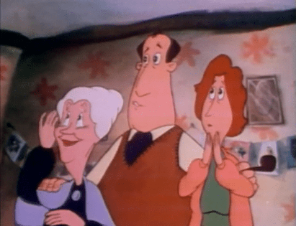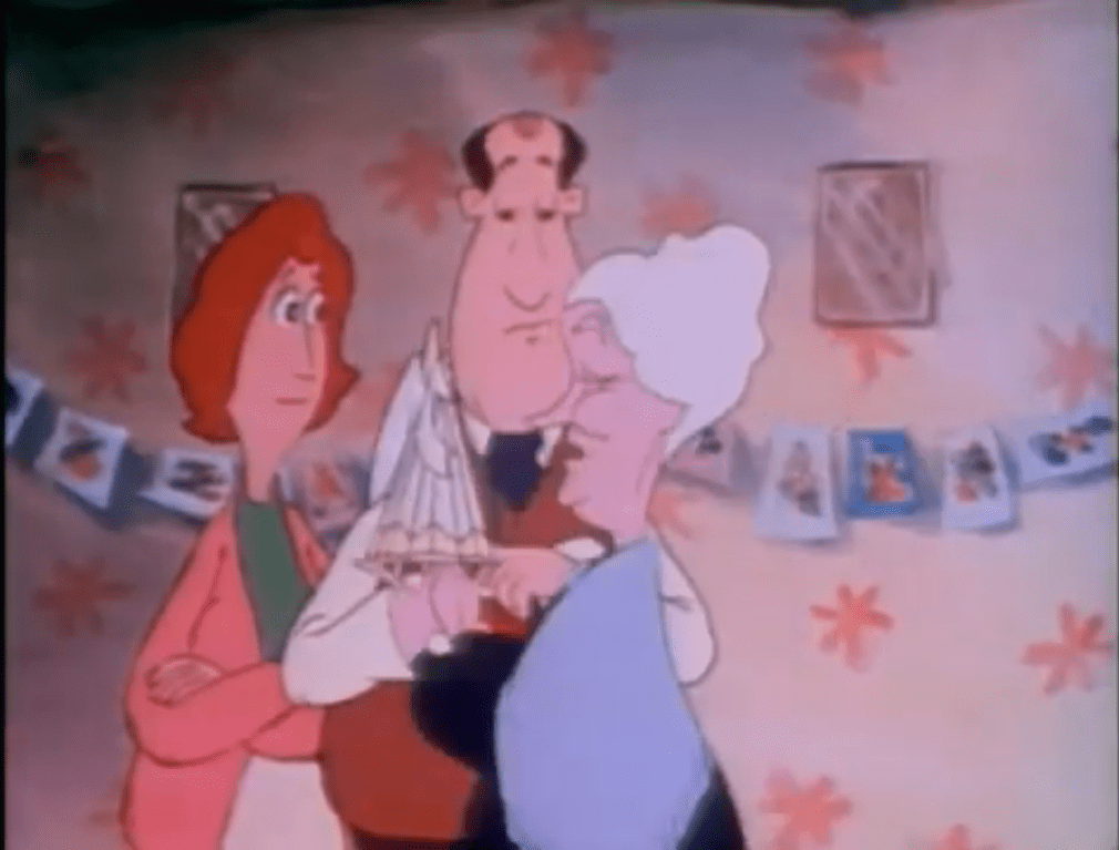 Back inside, Peter adds the logs to the poorly animated fire and asks his grandmother to explain what Christmas was like in the old days. She chuckles and takes a seat with her knitting and explains how her dad used to get a big tree and they’d decorate it with homemade ornaments. One of the alien men then remarks, “You mean, like this?” Round faced guy’s face then glows and a bunch of stars emerge. They form a large light as another song begins, this one a somber tune about the passage of time. The light comes together and forms the shape of a tree. A bunch of ornaments and decorations come into being carried by turtle doves and ribbon as the tree is magically decorated. There are angels and gingerbread men dancing and one even emerges from the dad’s pipe. As they flitter about the tree, Granny also remarks how they always had a big, silver, star for the top of the tree, so naturally one appears. She goes on to add that branches of fir would be placed on the mantle, so they too appear along with a skinny looking rabbit. He’s pretty alarmed to find himself here and jumps off giving everyone a laugh. Granny then talks about the food her mother would prepare, so that appears as well. These alien dudes are pretty convenient to have around. The creations are all animated in a wavy manner so perhaps these are just apparitions.