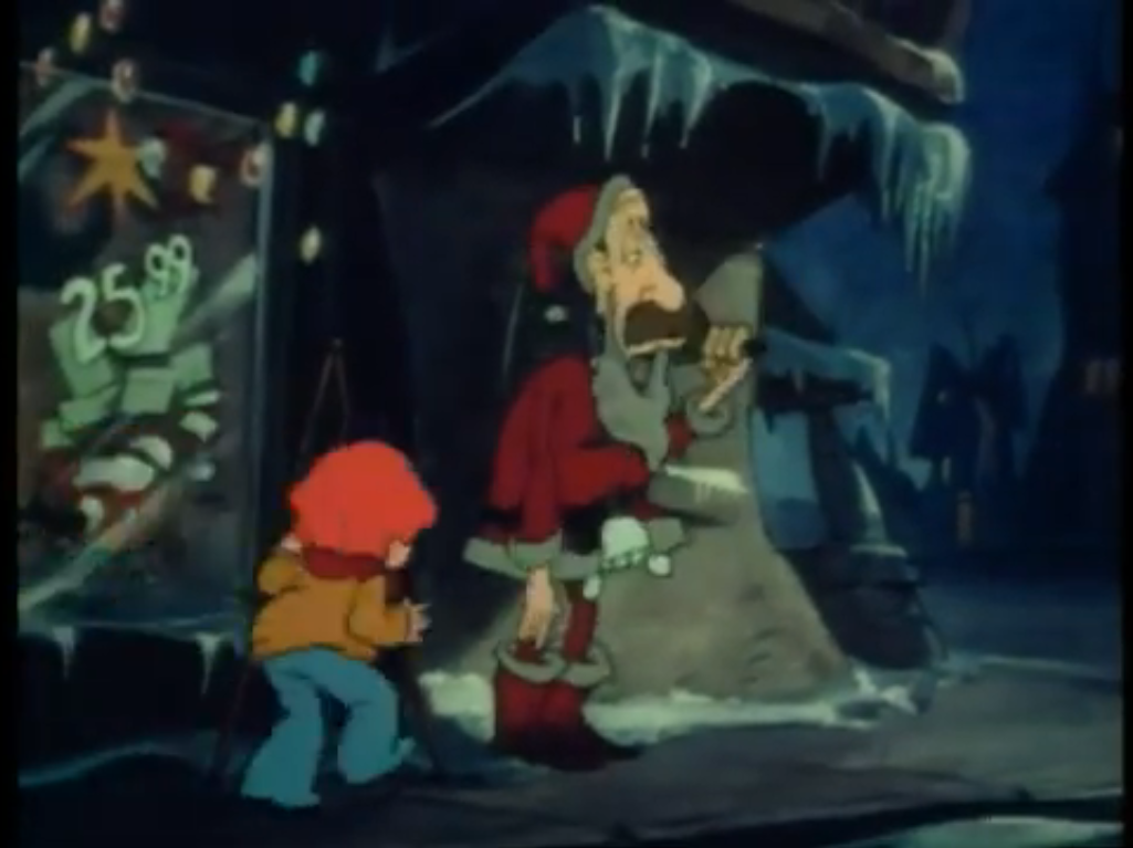 We soon find out that Lucy is not a person, but a goose. And it’s a goose that is wearing what looks like pink pajamas. Why? I don’t know, but don’t expect to find out. We then cut to a very tired looking individual dressed as Santa Claus (Martin Lavut). He’s ringing a bell and trying to raise money for the less fortunate. Peter comes running up to him and refers to him as Santa Joe. He asks him how’s it going and Joe replies not so well. Peter doesn’t have much to say in return, but wishes him a merry Christmas and takes off with his goose at his side. Some kids then show up to claim they’re the less fortunate he’s looking to help. They appear to be something akin to the local riff raff. They mock him, while the apparent leader of this troupe, Marvin (Greg Rogers), gets a little more face time. He’s an oddly designed character. He has shaggy bangs which his eyes are drawn over and these pants that sort of resemble bell bottoms (it was the 70s, after all) that are purple and covered in stars. The pants don’t really end in shoes though, a trait also shared by Peter. Compare him to Santa Joe who looks like a more conventional and real person, albeit stylized for a cartoon, and you would think they’re from two different productions.