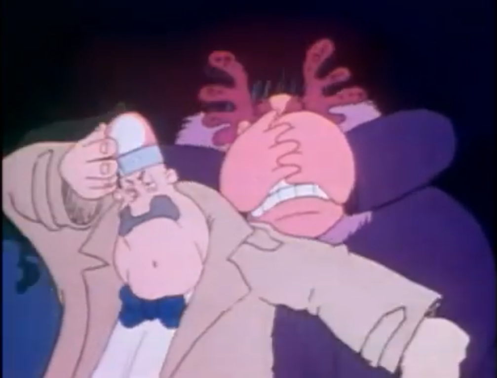 As Lucy turns up her beak and walks away, little tears run down her face. One of the aliens asks if this is “caring” while Peter tries to convince Lucy that those kids were only kidding (nice try). The sperm bot then follows Lucy close behind and appears to really be sizing up her caboose as if it may be pondering what roast goose tastes like (in my experience, bad). Does this thing eat? Or is this just a fake-out? Or could it be a lustful gaze? Maybe that as we go into another musical bit. It’s a piano medley and as it goes along the robot demonstrates its ability to shapeshift. It even sprouts arms and legs and does a Michigan J. Frog type of dance. The robot looks almost longingly at Lucy and now I’m thinking it’s not looking to eat Lucy. Or, well, maybe it is in a different kind of manner. Lucy plays hard to get, but relents and the two dance together. They end by slamming butts together and having a hearty laugh. I am now rooting for this pair to become an item by the time this is over just for the sheer absurdity of it. Also, I’m left thinking it’s weird that this shape-shifting robot can apparently be anything, but it chooses to resemble a floating sperm.