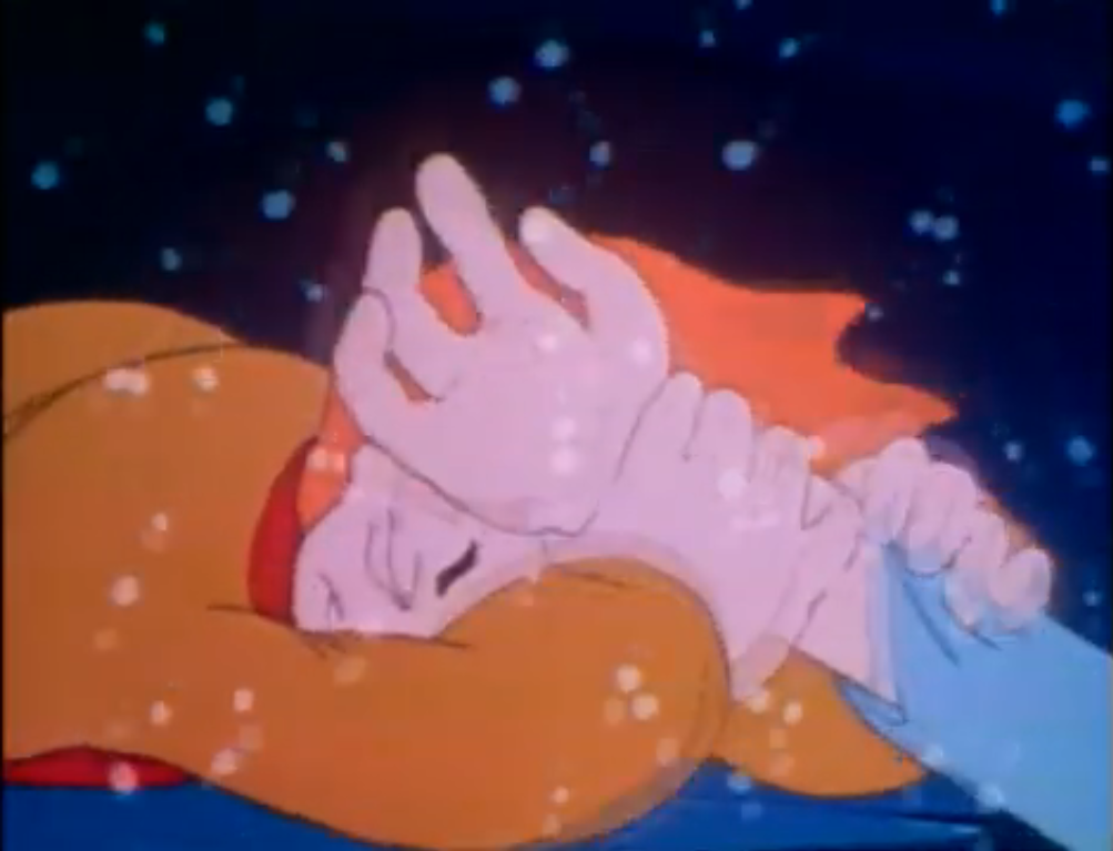 Peter and Lucy run off into the woods and while the animation isn’t doing much for me, I will say the setting looks appropriately cold. Cold enough that I catch myself telling Peter to just go home assuming he has a home. He clearly is short on friends since he hangs around with a goose in pajamas. It’s time for a musical montage where we see Peter and Lucy doing winter things like making snow angels and looking at the stars, which is appropriate as the song would seem to be called something like “Why Don’t They Look to the Sky?” At least, the vocalist punctuates every verse with that question. I suppose now is a good time to mention that the music is credited to Sylvia Tyson and since the vocalist is feminine sounding, it may even be her that’s singing.