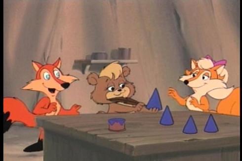 We’re then taken to another area of the fictional Hidden Hollow. There we see a family of owls reading because owls are wise and all that. One owl, though, is not. He’s Hootie (very original), and he’s dumb. His book titled “How to Fly” is upside down and when his dad tells him to turn it around he just spins it in a 360 degree manner. His dad is so angry at his son’s stupidity that he tells him to get lost. Which is convenient, since a bindle has been sitting beside Hootie the entire time. I have no idea what sort of lesson this is supposed to impart, but poor, dumb, mute, Hootie leaves the confines of the tree for the snowy ground below. There he encounters some raccoons who want to play ball with him. They’re very hostile though, but without really an end goal, it would seem. When Hootie demonstrates that he can’t fly, they laugh at him so he scoops up his little bindle and trudges off into the woods.