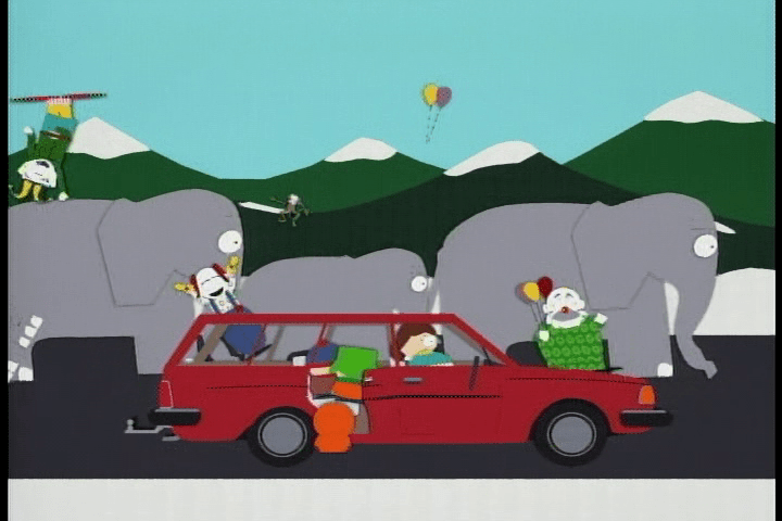 Outside Cartman’s house, Kyle (Stone) and Kenny (Stone) are being dropped off by their parents as they apparently got the okay to travel to Nebraska with the Cartmans. Kyle’s family doesn’t care about it interfering with Christmas since they’re Jewish while Kenny’s family is just hoping he can smuggle home some turkey for them. Stan then shows up to the surprise of the other boys who somehow found out he couldn’t go, or they just expected his mother to say “No.” Stan, understandably, wants to get moving so he just heads straight for the car. Cartman then goes to hop into the front seat, but finds Kenny already there which pisses him off because he’s a spoiled little piece of shit. He tries to tempt Kenny to vacate the shotgun position by saying there’s a sale on orange jackets down the street and also by claiming there’s an elephant parade taking place. When neither works, Cartman pulls a dollar out of his pocket and tosses it like a kid playing fetch with a dog. That works and Cartman smiles at himself for his fast thinking and also calls Kenny a poor piece of crap. As the car pulls away, an elephant parade can be seen taking place in the background.
