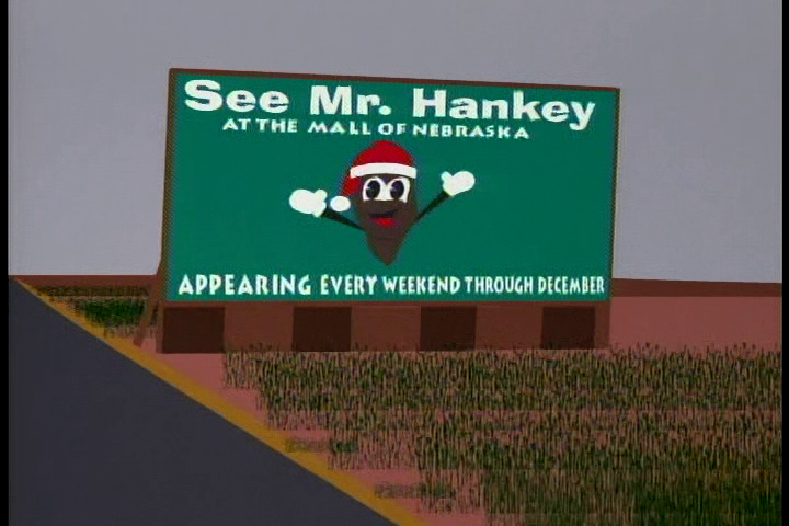 Cartman’s mom announces they’re about to enter Nebraska and when they do the background goes from snow to brown crops and a slow, twangy, banjo, theme enters. The boys are unimpressed, but Cartman’s mom tries to explain Nebraska’s local agriculture until her son rudely tells her to shut up. The boys soon have their attention sapped away by a billboard advertising Mr. Hankey at a local mall. Apparently, the events of last year’s Christmas special have raised his profile considerable so Mr. Hankey isn’t just a Christmas icon in South Park, but the whole country. The kids all want to go and Cartman’s mom is happy to inform them that Cartman’s grandma lives near that particular mall. Cartman then asks his mother why his grandmother has to live so far away? He doesn’t like driving six, god, damn hours to get a present and would rather they just stick grandma in a nursing home close to them. His mom tells him they need to get him out of his grumpy mood and she knows the best way: through song! The two begin singing their awful song again, much to the chagrin of the boys in the backseat.
