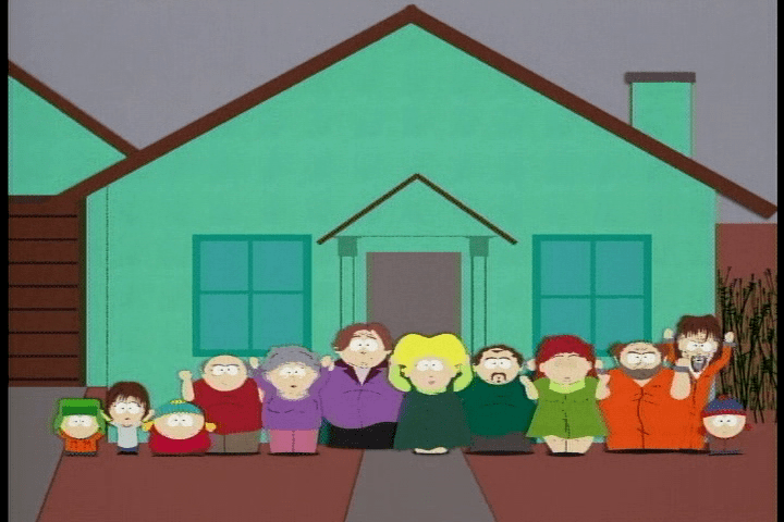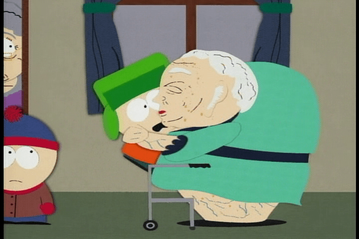 The long ride finally ends and the boys practically run out of the car to get away from Cartman and his mother’s singing. Unfortunately for them, things aren’t really going to get any better. Cartman goes racing up to the front door shouting “Grandma!” over and over. A large, old, man who basically looks like Cartman answers the door and soon Cartman’s grandma (Bergman) appears as well. She informs him that she got him a present and the little boy starts rubbing his hands together. When she says it’s inside, he shoves her out of the way and off the stoop and barges in. The rest of the crew follows and Cartman’s mom introduces the boys to the Cartman family. They basically all look like Eric Cartman, just older and fatter. Great Grandma Florence (Parker) then hobbles over and mistakes Kyle for Eric and gives him a big hug. He manages to wriggle away and informs Stan she smells like pee and vitamins.