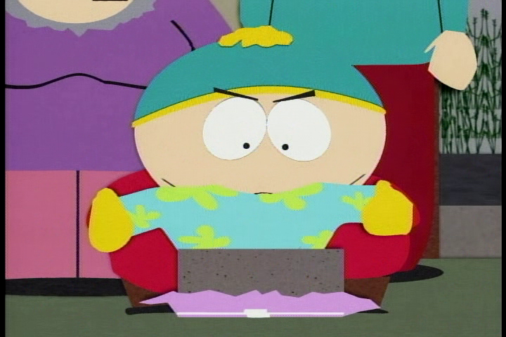 With the introductions out of the way, it’s time for Eric’s present. His grandma hands him a box and he rips into it only to discover it’s a shirt. His grandma tells him she thought it would look really good on him, but Cartman is not to be consoled. He angrily cries out that he drove 9 hours through butt-fuck nowhere for a god damn shirt! He then tells his mom grandma has gone senile and demands that she be stuck in a nursing home! No one reacts to Cartman’s outburst though as they seemingly all enable his awful behavior. I do question the wisdom of his grandma though to get him a shirt for Christmas. My grandmother was always keenly aware that kids do not want clothes, she she would give us the clothes first and then the toys. Maybe Cartman’s grandma knows he’s a little piece of shit and this is a troll job.