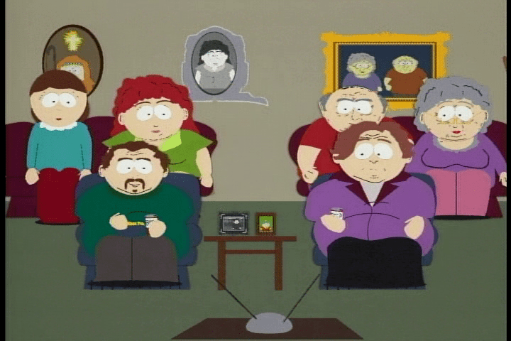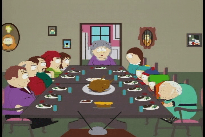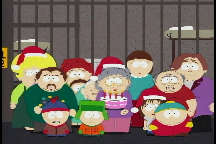 Cartman’s mom then asks Kyle if he wouldn’t mind holding Grandma Florence’s catheter bag at dinner. He is understandably repulsed by this and the bag is quite full. Normally, people just strap those things to their leg or something. Cartman’s grandfather (Parker) then draws attention to the fact that everyone is present, including Cartman’s Uncle Howard (Parker) appearing live via satellite from prison. The boys are pretty surprised by this and Cartman confirms he does this every year. His grandma remarks to Howard that he looks good and he just shouts back “No I don’t!” He’s probably right. Cartman’s cousin Elvin, a toddler who has a taste for Fudgsicles, throws his tasty treat at the TV seemingly not supportive of his uncle being here. Cartman’s grandma then asks her mother, Flo, if she could say “Grace.” Flo responds, “God damnit, why the hell do I always have to say ‘Grace’? If one more person asks me to say ‘Grace” I’ll be like, ‘Hey!, I’m not saying ‘Grace,’ and if you ask me again I’ll kick you straight in the nuts!'” She holds up a fork in a threatening manner for added emphasis, and when her rant is over Cartman just says “Amen,” and the rest of the family follows. They all dig in and start eating like savages, which the boys can scarcely believe. Jimmy, the family dog, then starts begging beside Grandpa who goes into a “No Jimmy, that’s my pot pie,” echoing a familiar refrain we’ve seen in the past with Eric. The whole family joins in telling Jimmy that’s Grandpa’s pot pie all in the same Cartman way. Stan confesses he doesn’t know how much more of this he can take. Meanwhile, Kenny is seen stuffing food into a paper bag.
