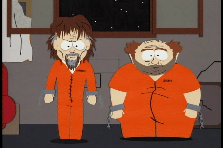 A news bulletin interrupts the football game and it’s to inform the public that Charles Manson is at large. It’s interspersed with actual footage of Manson while the news anchor (Stone) implores the public to punch his face in and kick his ass if they see him, and then call the police. When the bulletin is over the rest of the family finds out that they missed an incredible comeback in the football game causing them all to shout out “Lame!” In the hall, Eric’s grandma asks him if he can look after cousin Elvin for a bit as a favor to her. Eric just sighs and demands ten dollars and his grandma gives in without another word. Downstairs, It’s a Wonderful Life is nearly over and it’s not making Charlie feel any more in the spirit of the holidays. Quite the opposite, actually, as he sees Christmas as just another attack on him. The boys enter and Cartman brought his uncle and accomplice some sticky buns. They’re pretty happy to have them as the boys lament their current situation. When Charlie finds out about it he volunteers to drive the boys to the mall on account of the fact that he wants some action. Kyle tells him “Good for you,” while Howard thinks it’s bad a idea. Charlie will not be swayed though and he tells the boys he’ll hotwire the car and take them. Stan is a bit apprehensive about trusting this guy, and it’s become clear the boys have no idea who he is, while Cartman tells him he needs to start trusting people.
