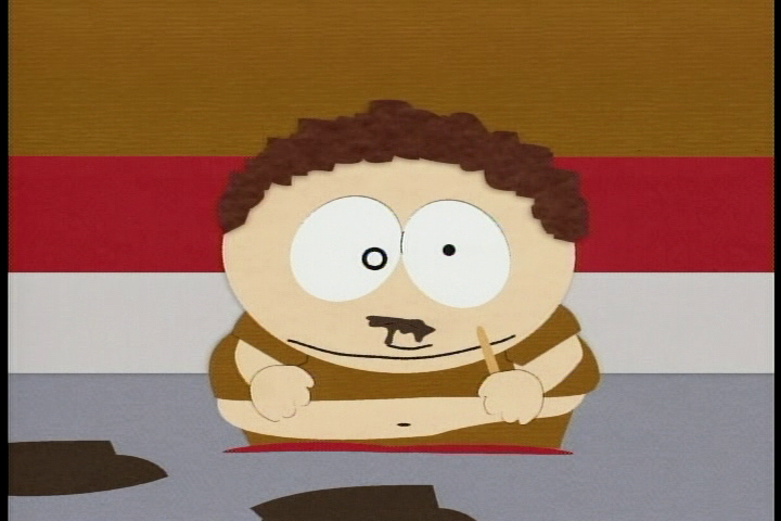 At the mall, the boys are stuck in a very long line to meet Mr. Hankey. Manson is just standing there with them too seemingly unafraid to be out in a very public setting wearing a prison jumpsuit and sporting a pretty hard to miss swastika tattoo. Kyle is super excited to see Mr. Hankey again, while Cartman notices that he’s also adertised to be appearing at another nearby mall. He questions how he could be in two places at once, but Kyle isn’t swayed and dismisses it as magic. Kenny is shown just staring at Manson who in turn is staring at him. He asks the boy if he would like to head to a more secluded section of the mall and Kenny can be heard saying through his coat, “Okay!” The two walk off and Stan announces that he really likes Charlie. Elvin then realizes he’s finished his Fudgsicle and starts crying. Cartman, having no idea what to do, grabs a club like object and bashes him over the head. It works as he stops crying, but one of his eyes is drawn as a circle instead of a dot and he’s no longer making any sound. Cartman actually looks a bit concerned.