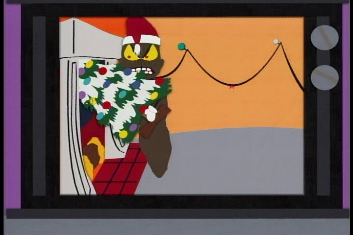 In a not so secluded area of the mall, Charlie is giving Kenny a sermon of sorts on the subject of his ruthlessness. He sounds like he’s about to go on a rampage, but then gets distracted by another Christmas special. It’s How the Grinch Stole Christmas, only all of the characters have been replaced by poop. It’s the part where the Grinch is shoving the tree up the chimney and is interrupted by little Cindy Lou Poo. I could see the estate of Dr. Seuss not appreciating this beloved, children’s, classic getting represented as shit onscreen, but they let Mike Myers play The Cat in the Hat so I have no sympathy for them.