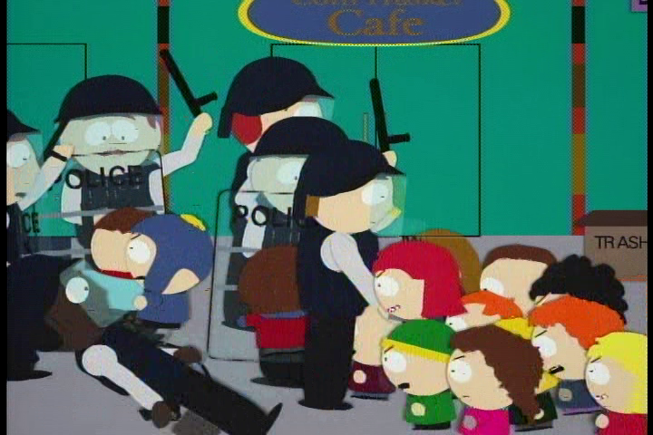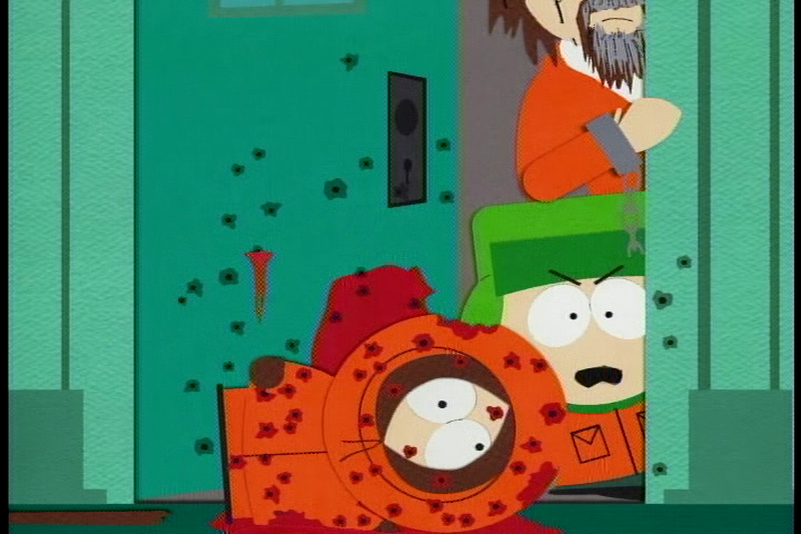 Charlie returns to the living room and apologizes to the Cartman family who are all still seated in front of the TV seemingly unbothered by all of this. Charlie tells them he intends to surrender and asks if anyone has a white flag they can wave. Outside, we see the cops as they’re nearly ready to march on the house, but the front door opens. A white flag appears and it’s being held by, you guessed it, Kenny. The lead cop (Stone) shouts out “He’s holding a white flag!” as they all take cover and open fire. Kenny is riddled with bullets prompting Charlie to remark, “They killed the little orange coat boy.” Kyle finishes it off with a “You bastards!”