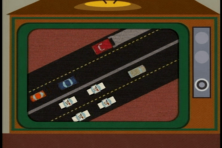At the Cartman house, everyone is still watching TV when news breaks about Charlie Manson’s run from the law. Grandma notices the car on television being driven by Manson resembles her husband’s, but doesn’t take it a step further. In the car, the cops are gaining on the boys until Elvin tosses his Fudgsicle out the window. The cops cry out “Fudgsicle!” and try to avoid it causing a pile-up to Elvin’s delight. The someone screams out the name of a harmless object only for it to lead to mayhem is a common joke for South Park (“Peeps!”). Even with Elvin’s assistance, there are still a ton of cops after them. Charlie pulls the car into the driveway of the Cartman residence and Grandma is outside to greet them for some reason. He barks at her to get in the house as the cops come flying in.